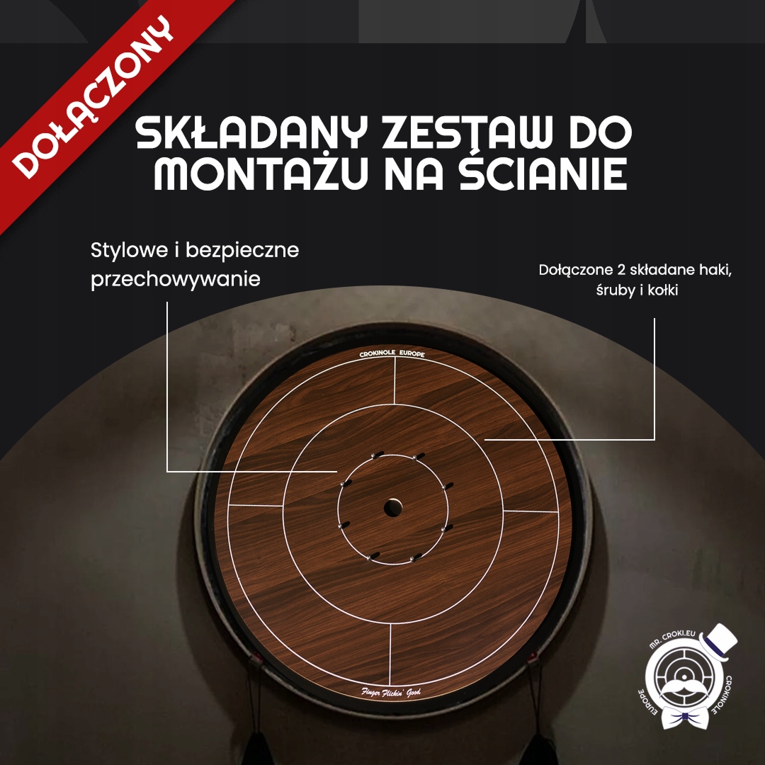 W zestawie znajduje się 24 krążki (12 w kolorze drewna, 12 czarnych) w rozmiarze turniejowym oraz wysokiej jakości proszek poślizgowy, który poprawia ruch krążków. Ten zestaw nie zawiera uchwytu ściennego – idealny dla graczy, którzy chcą przechowywać planszę w sposób elastyczny.