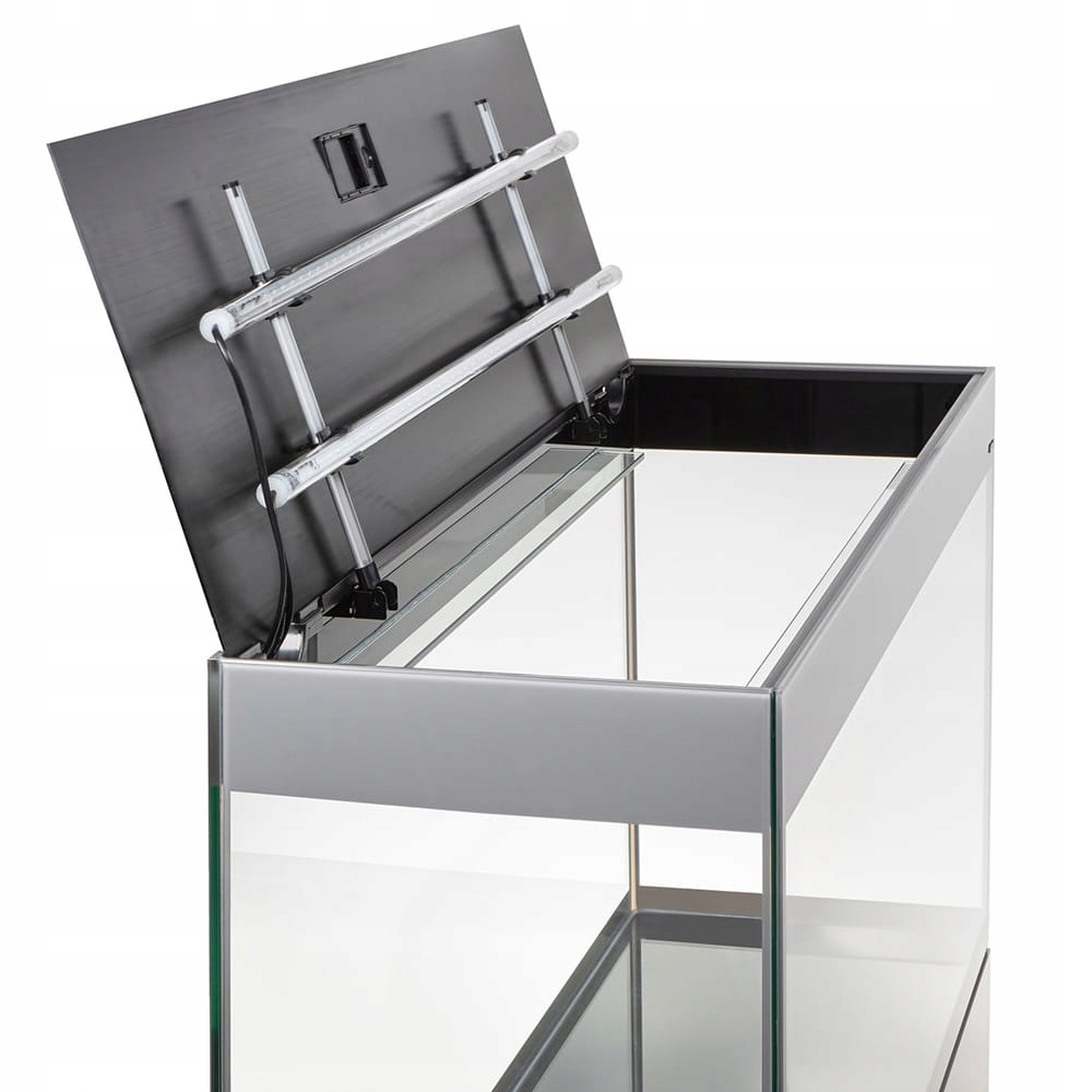 Gdy musisz mieć dostęp do wnętrza akwarium, pokrywa wraz z uchwytami jest podnoszona i ustawiona pionowo na tylnej ścianie. Takie rozwiązanie uwalnia ręce od koniczności podtrzymywania klapy. Ale to nie wszystko – światło skierowane jest nadal do wnętrza zbiornika, dzięki czemu wszystkie prace serwisowe w akwarium wykonasz przy pełnym oświetleniu.
