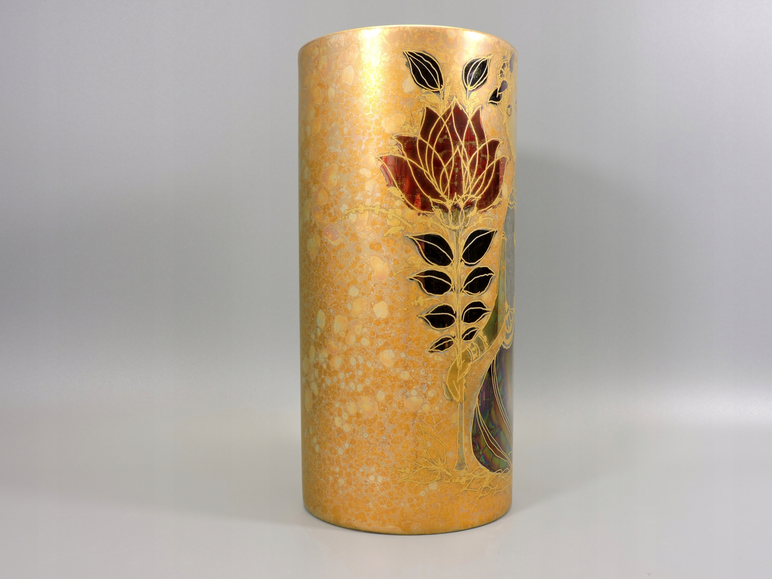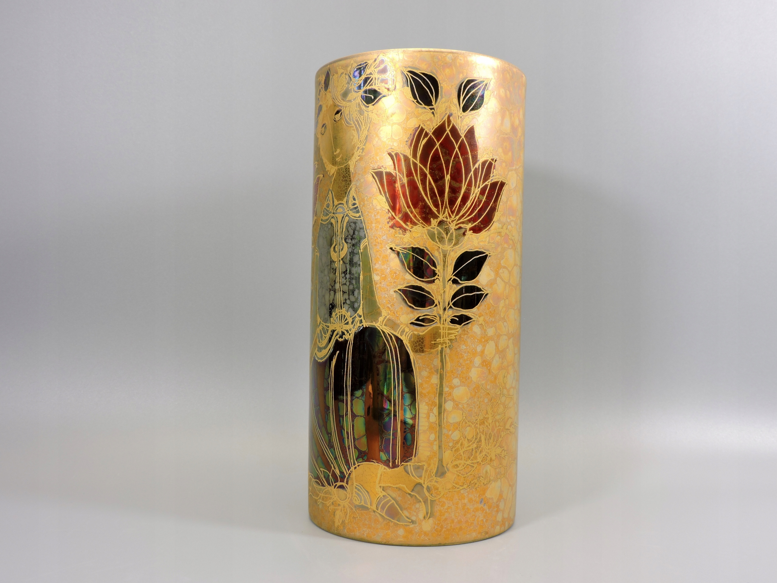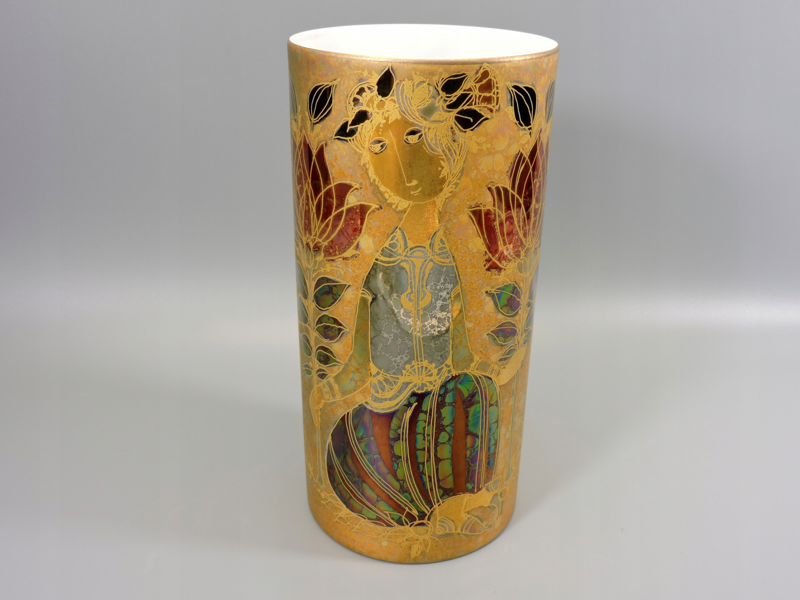 Prosta nowoczesna forma, wspaniałe ręcznie malowane zdobienie nasycone złotem, stylu Wiinblada, wraz z zmianą światła oddają inne odcienia