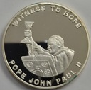 Przedstawiona moneta stanowi wyjątkowe dzieło numizmatyczne, będące hołdem dla jednego z najbardziej znaczących papieży w historii – Jana Pawła II. Na awersie widnieje majestatyczna scena przedstawiająca Papieża podczas podniesienia kielicha eucharystycznego, co symbolizuje głęboką duchowość, nadzieję i wiarę, jakie niósł światu. Napis "WITNESS TO HOPE" (Świadek nadziei) podkreśla jego rolę jako duchowego przewodnika milionów wiernych na całym świecie.