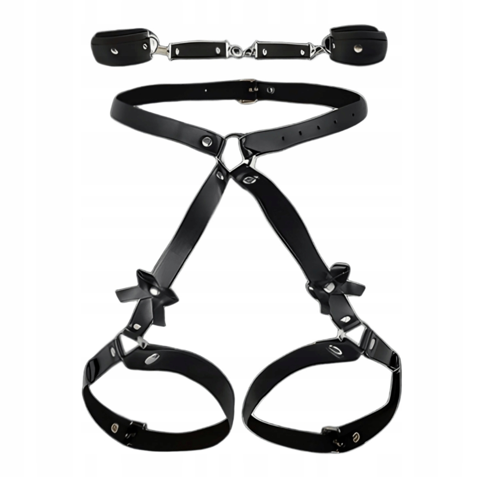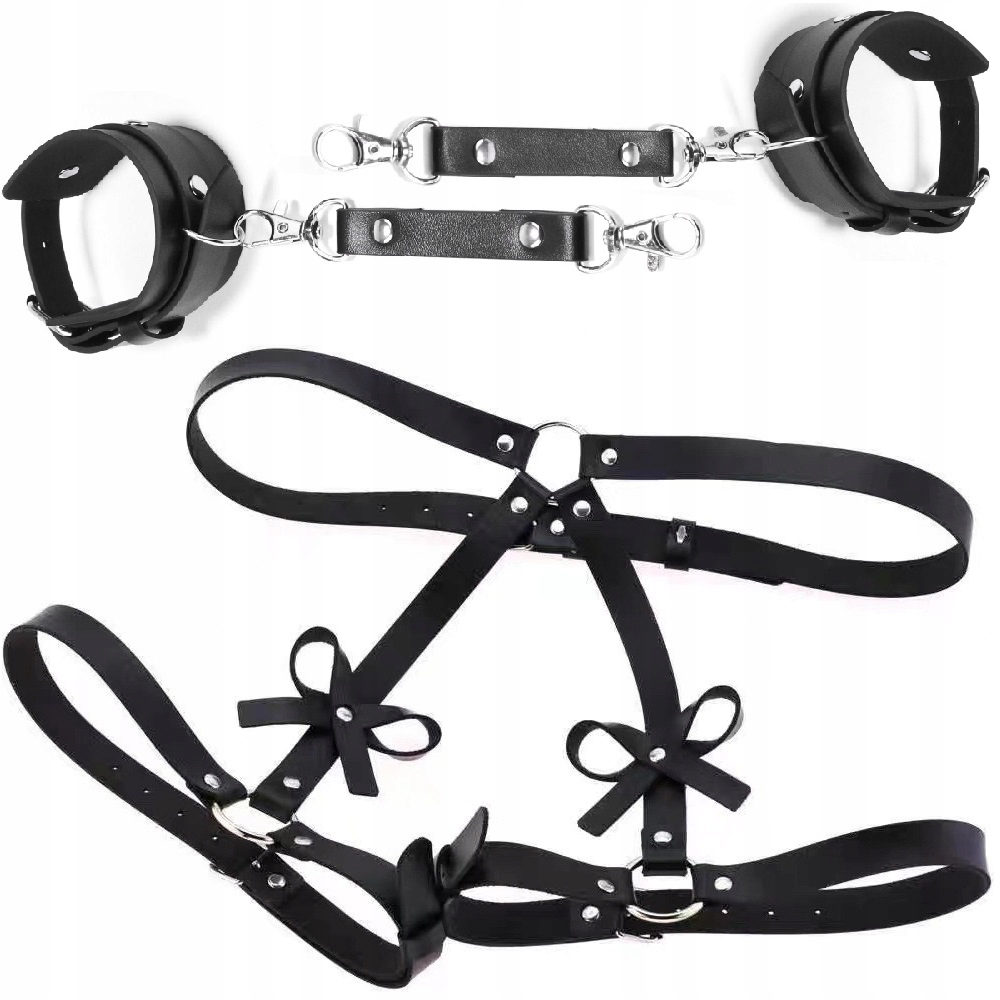 Pas oplata talię i uda, a ręce zostają unieruchomione w kajdankach, tworząc pozycję, która łączy bezradność i prowokującą ekspozycję. Każdy dotyk staje się mocniejszy, a kontrola nad partnerem – pełna.