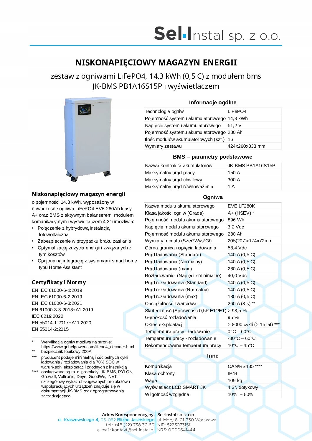 Montaż magazynu wykonany przez zespół wykwalifikowanych elektryków w firmie Sel-Instal. Wykorzystujemy zaprojektowaną i produkowaną w Polsce obudowę zapewniającą kompresję ogniw (zwiększenie trwałości), przy zachowaniu kompaktowych wymiarów.