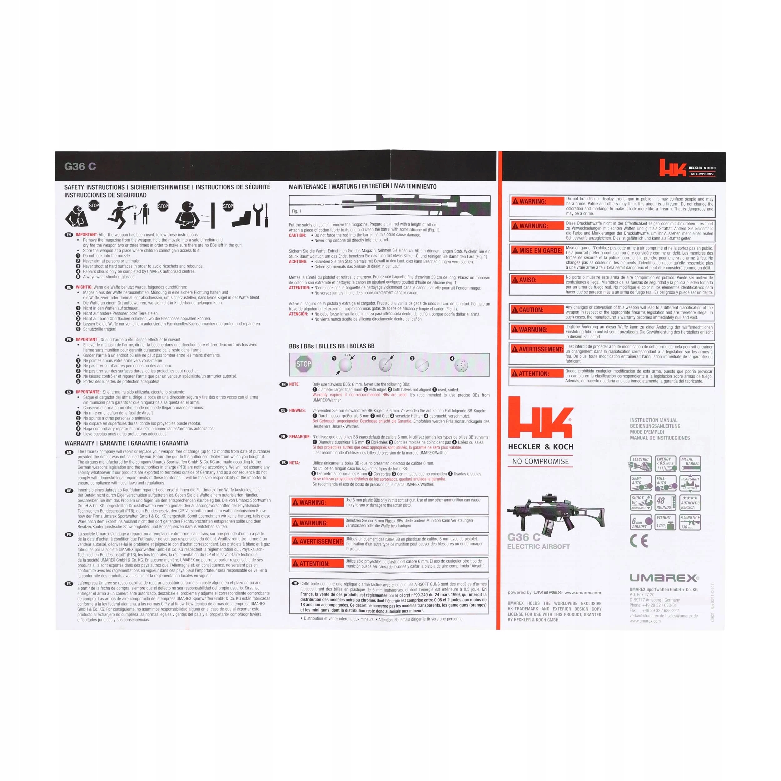 W zestawie znajduje się polimerowy magazynek mid-cap o pojemności 48 kulek. Dzięki bocznym zaczepom, magazynki od HK G36 C można łączyć razem, co znacząco przyspiesza i ułatwia ich wymianę.