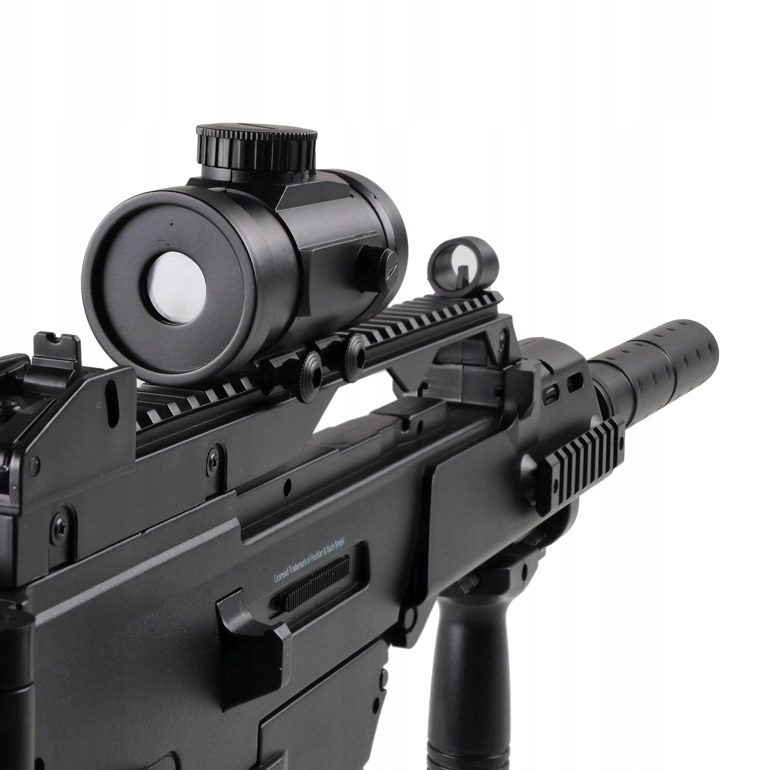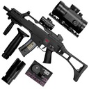 H&K G36C to elektryczna replika asg, przeznaczona dla początkujących graczy wyposażona w celownik kolimatorowy, chwyt przedni oraz atrapę tłumika dźwięku.