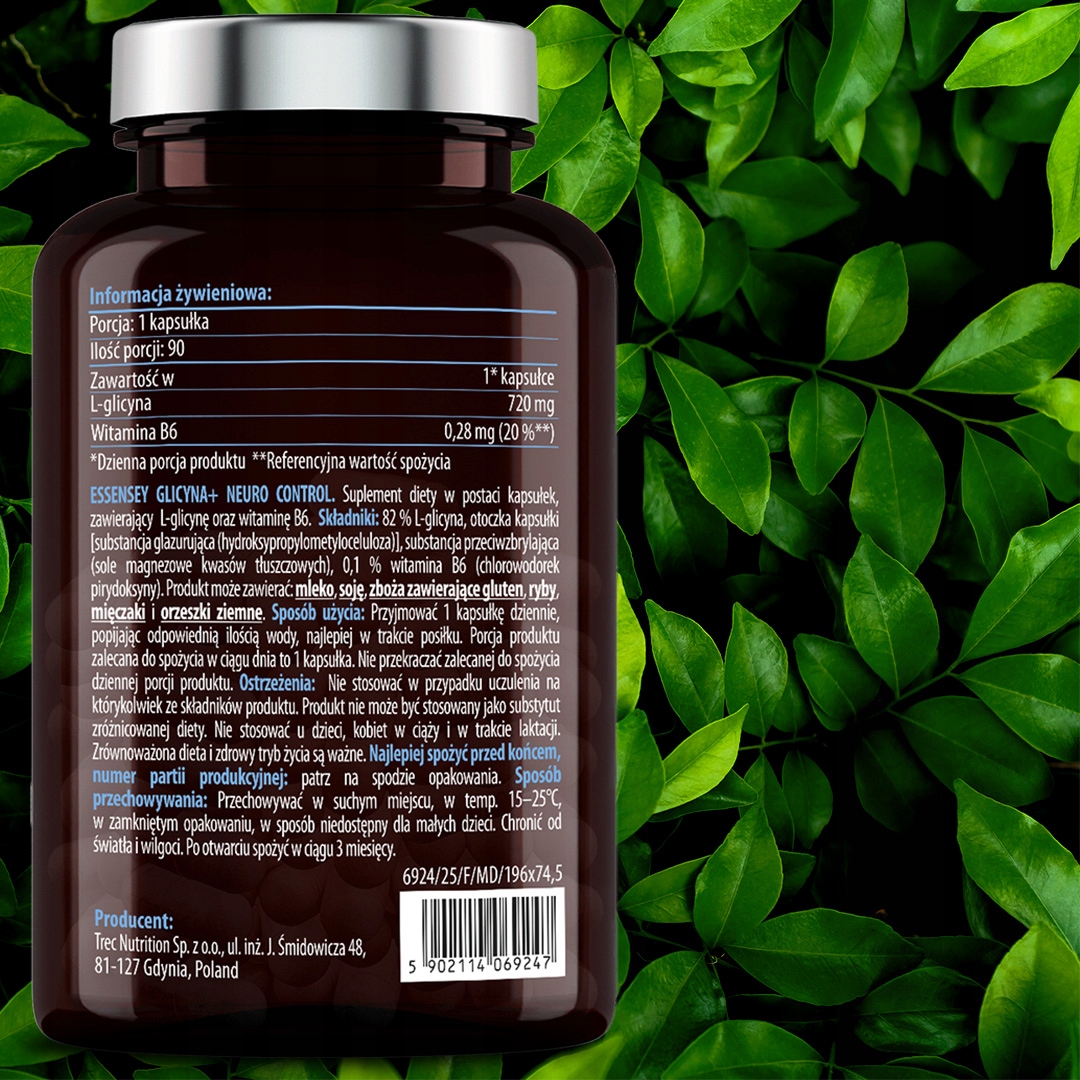 ESSENSEY GLICYNA + NEURO CONTROL to nowoczesny suplement diety w formie kapsułek, łączący wysoką porcję glicyny z witaminą B6, znaną ze swojego korzystnego wpływu na układ nerwowy i zmniejszenie uczucia zmęczenia.