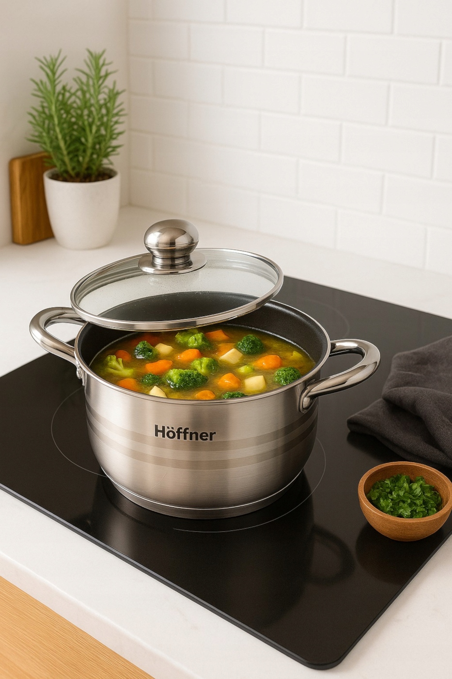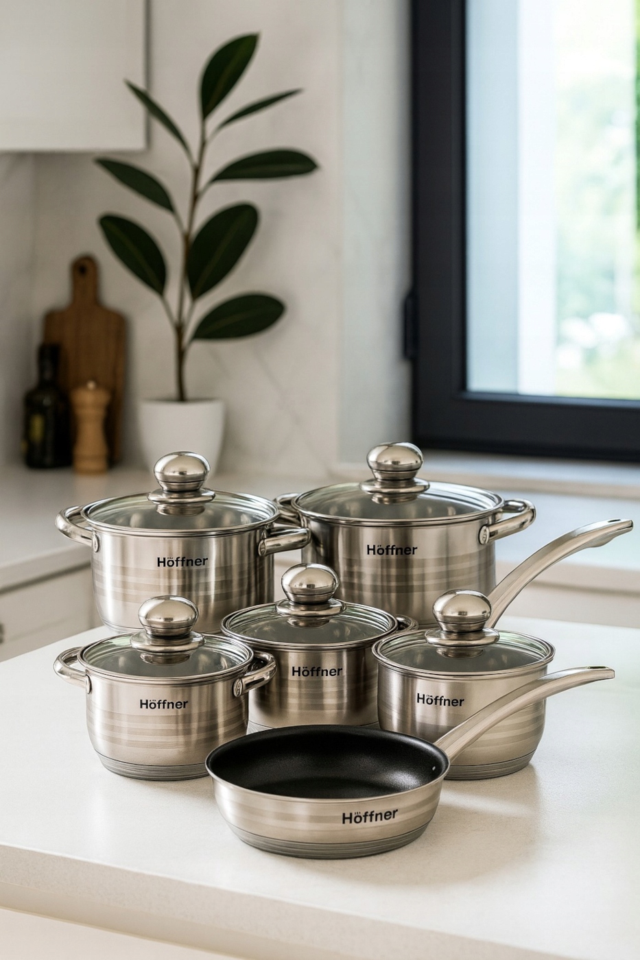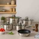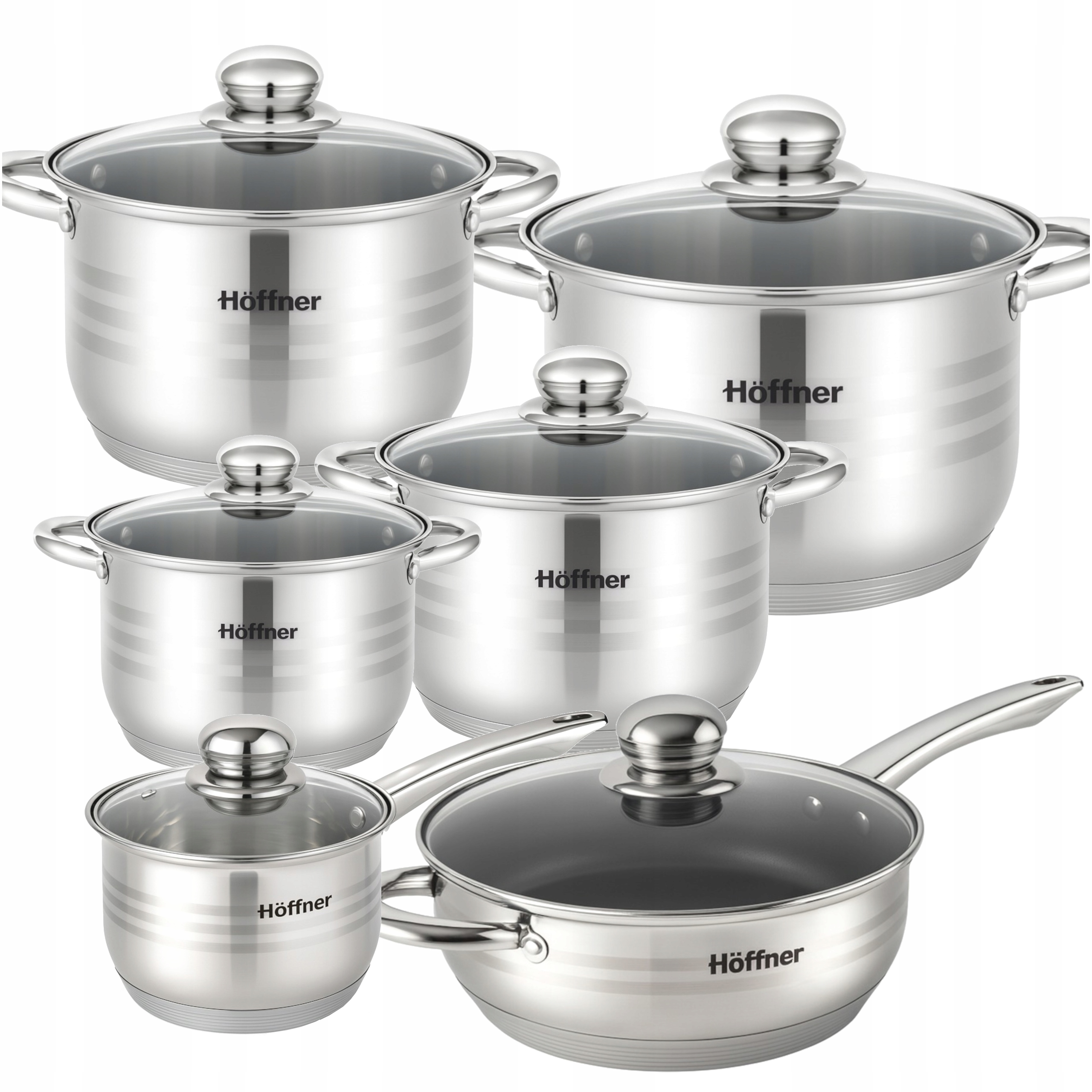 Zestaw garnków 12-elementowy HÖFFNER Elegance łączy minimalistyczny połysk z trzema delikatnymi pasami zdobniczymi, tworząc elegancki design, który podkreśli każdą kuchnię – klasyczną i nowoczesną. Komplet który spełni oczekiwania nawet najbardziej wymagających domowych szefów kuchni. Trwałość, funkcjonalność i elegancja – wszystko w jednym komplecie!