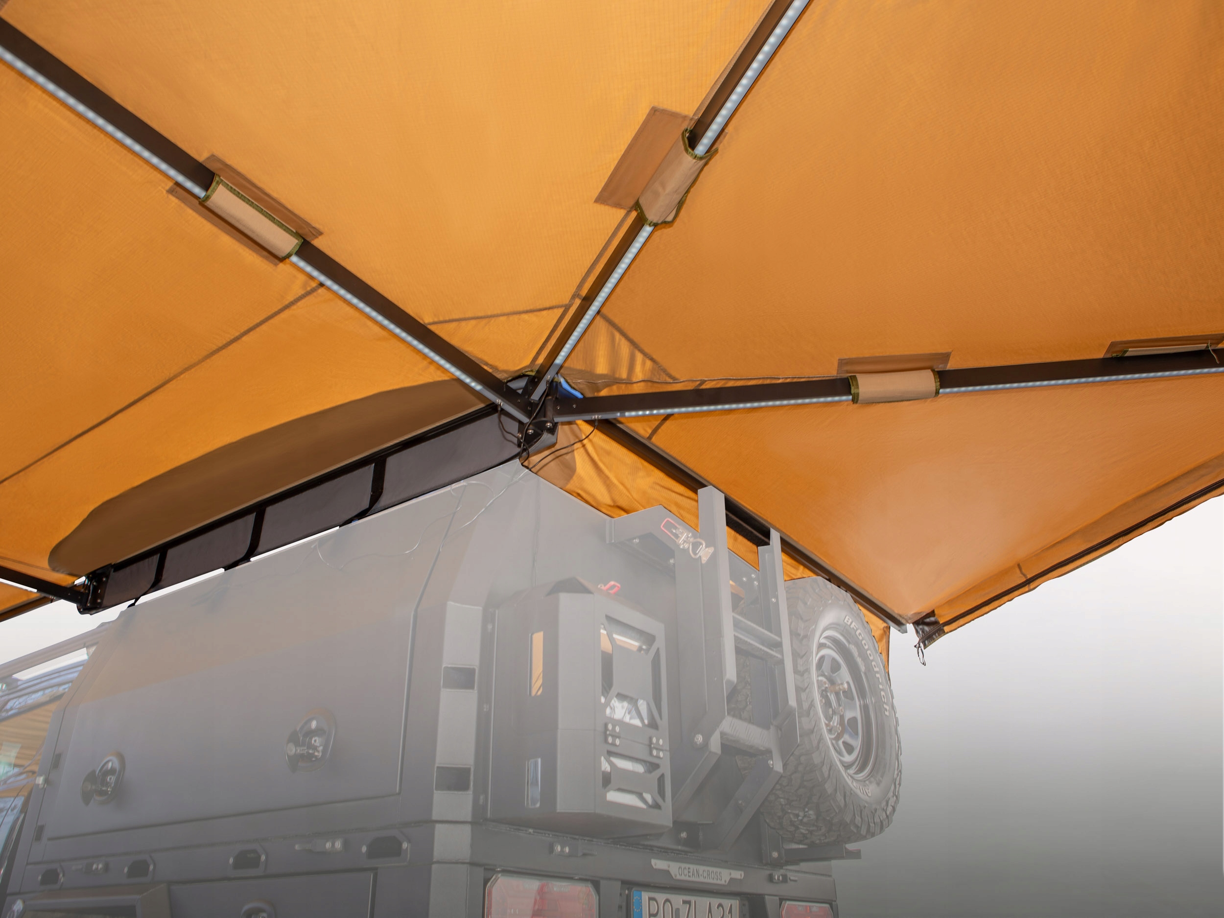 Markiza Foxwing HD 270° może być rozłożona z łatwością przez jedna osobę. Markiza zamknięta w pokrowcu ma 2,2m długości, mocujemy ją do bagażnika dachowego za pomocą specjalnych super mocnych adapterów.