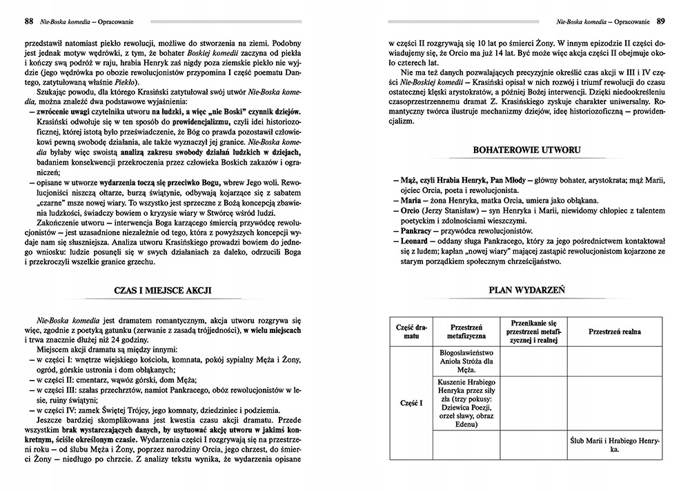 Wydanie Nie-Boskiej komedii kompletne bez skrótów i cięć w treści. W tym wydaniu znajdziesz odpowiedzi na pytania z podręcznika - „pewniak na teście”, czyli wskazanie zagadnień, które zwykle pojawiają się w pytaniach z danej lektury we wszelkich testach sprawdzających wiedzę, a także w podręcznikach i na klasówkach. Książka zawiera pełen tekst lektury. Na końcu książki zamieszczono opracowanie, w którym znajduje się bardzo szczegółowe streszczenie oraz drugie skrócone, ułatwiające szybkie przygotowanie się przed lekcją. Opracowanie zawiera ponadto plan wydarzeń, wnikliwie wyjaśnioną problematykę oraz szerokie charakterystyki bohaterów.