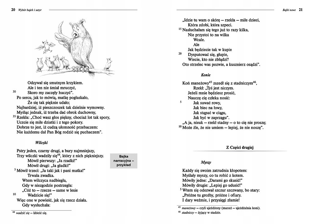 Wiersze podzielono na dwie grupy - znajdują się tutaj bajki z popularnych zbiorów Bajki i przypowieści oraz Bajki nowe (m.in. Ptaszki w klatce, Kulawy i ślepy, Jagnię i wilcy, Wilczki), a także najbardziej znane satyry (Żona modna, Świat zepsuty, Pijaństwo, Do króla).