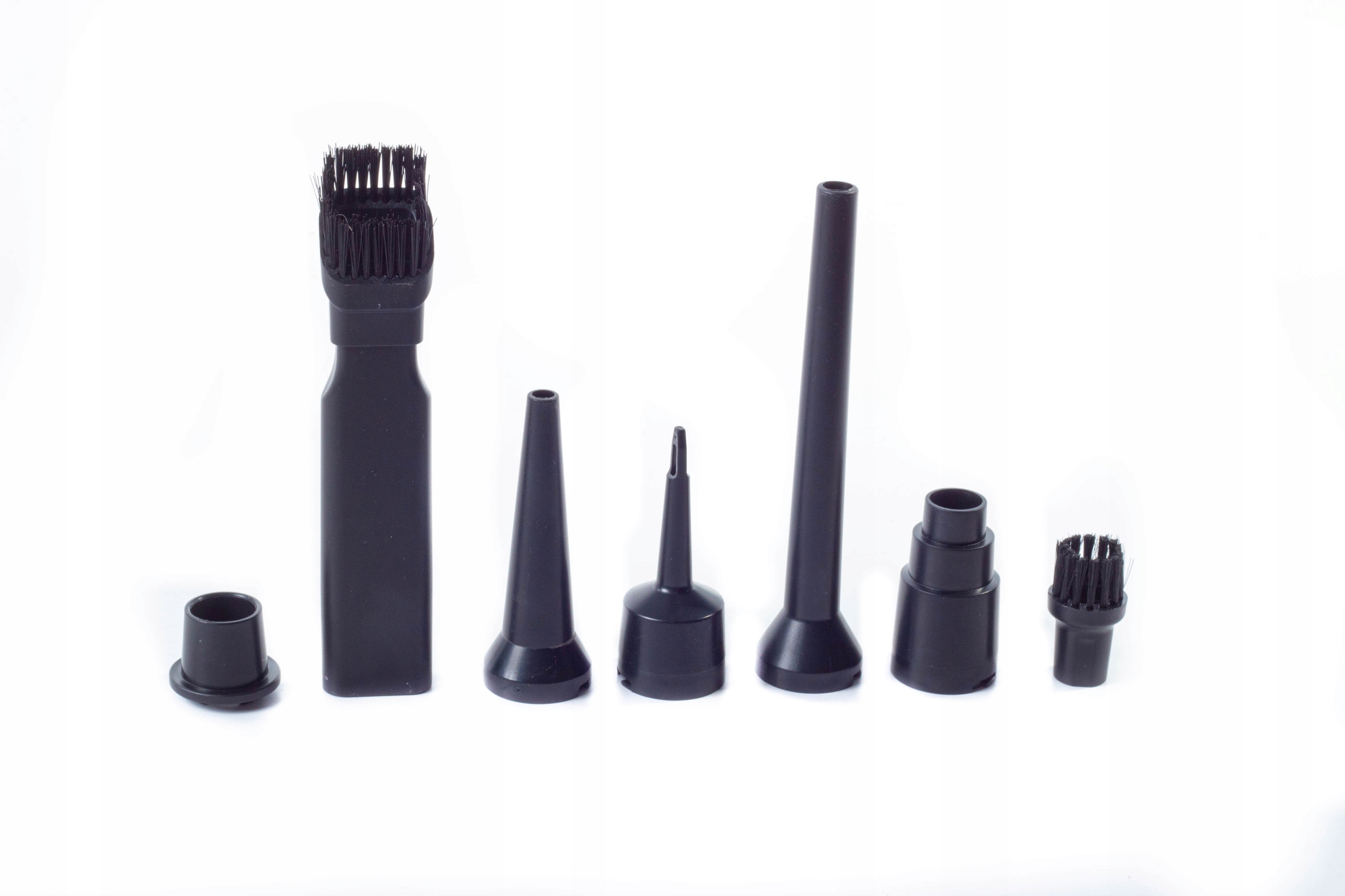 Długa płaska dysza ze szczotką umożliwia czyszczenie szczelin, szczelin, szczelin i innych trudno dostępnych miejsc, a mała dysza szczotkowa pomaga w czyszczeniu delikatnych powierzchni, takich jak skóra i zamsz.