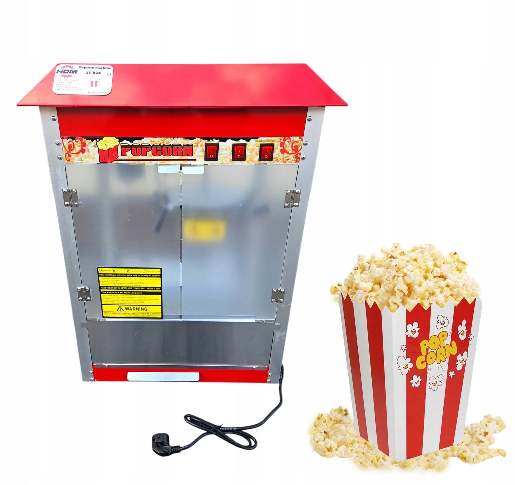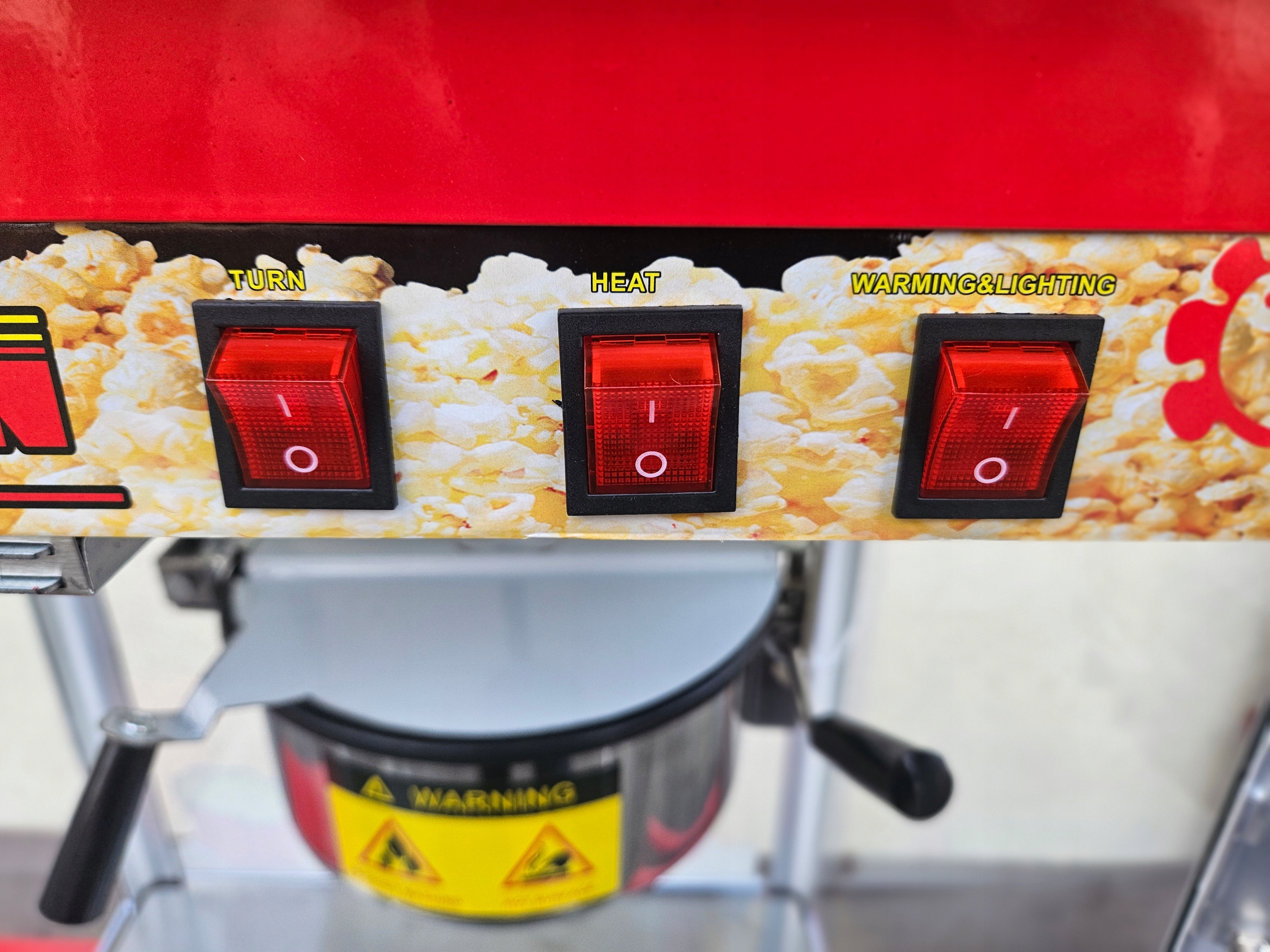 Uruchomienie urządzenia do popcornu jest niezwykle proste. Wystarczy podłączyć przewód zasilający o długości ~ 2m do gniazdka. Nad drzwiami znajdują się trzy przełączniki. Przycisk HEAT aktywuje element grzewczy. Aby podczas produkcji nie przypalić ziaren na dnie garnka, włącz system mieszania za pomocą guzika TURN. Dodatkowo powłoka teflonowa na garnku zapobiegnie przywieraniu popcornu. Przełącznikiem POWER & LIGHT włączysz podświetlenie i grzanie komory.