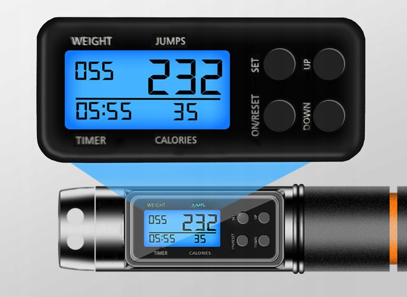 Wyświetlacz LCD wskazuje: ustawioną wagę, czas treningu, a także liczbę skoków oraz ilość spalonych kalorii