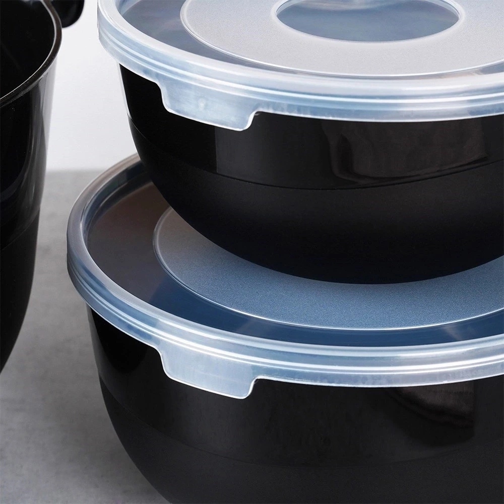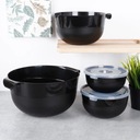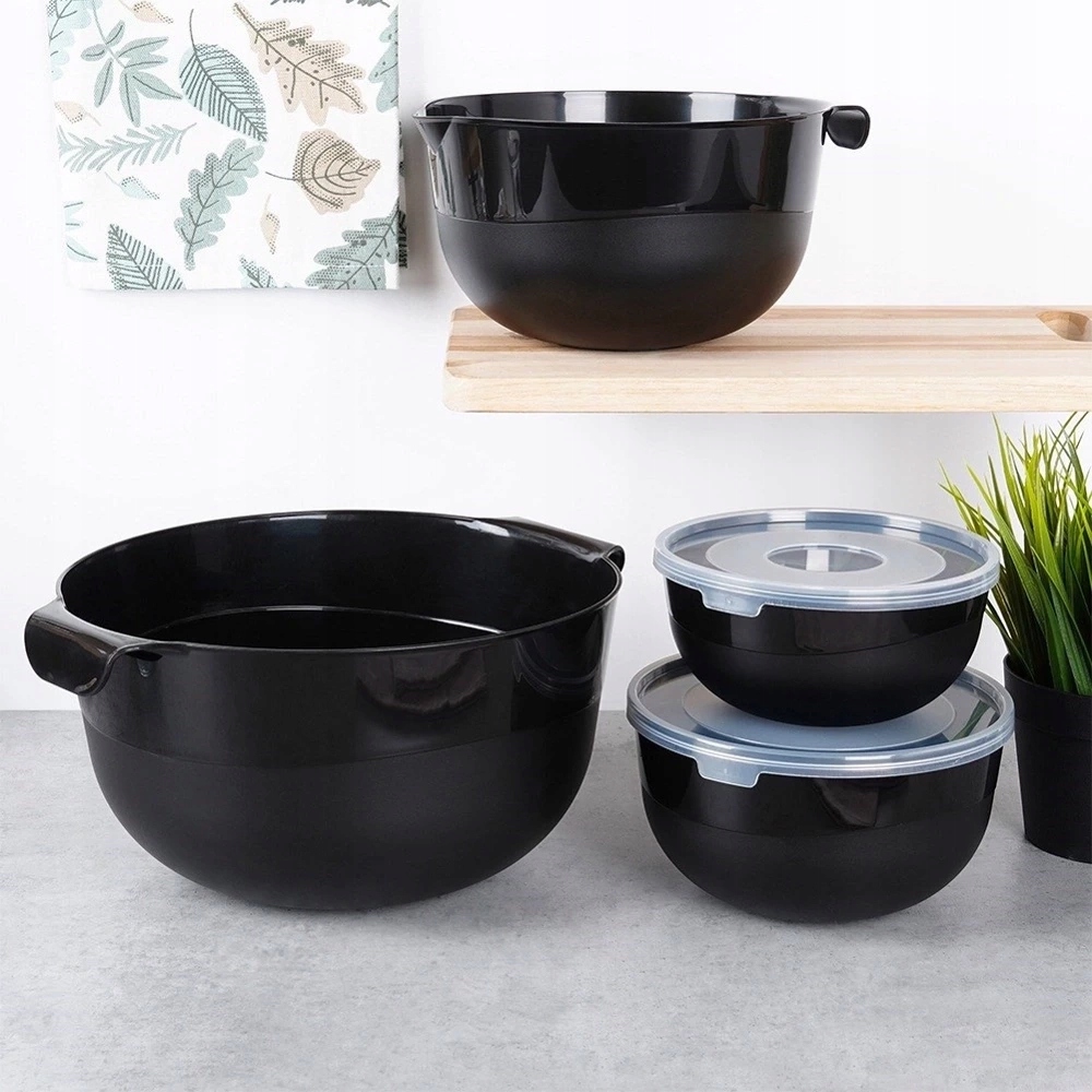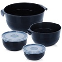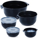 Zestaw czterech misek kuchennych o pojemności 700 ml, 1,2 l, 2 l oraz 4 l. Idealne do mieszania, ubijania, miksowania czy przechowywania. Dwie miski posiadają pokrywki.
