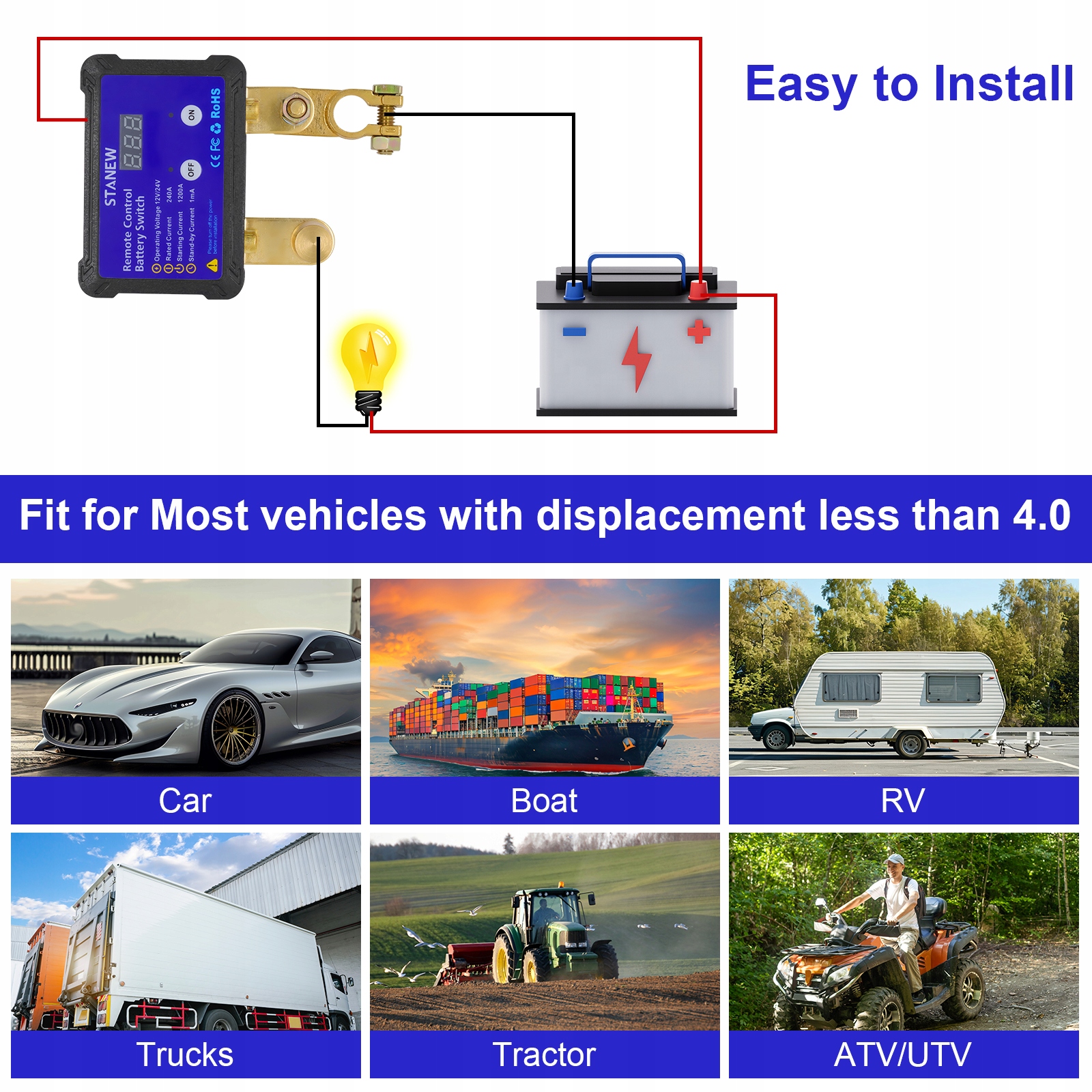Ten zdalny wyłącznik akumulatora oferuje szerokie możliwości zastosowania i nadaje się do szerokiej gamy urządzeń 12 V/24 V z silnikami o pojemności poniżej 4,0 litrów. Jest kompatybilny z popularnymi pojazdami, takimi jak samochody, łodzie, kampery, ciężarówki, traktory i pojazdy terenowe/użytkowe, zapewniając niezawodną ochronę akumulatora dla różnych urządzeń.