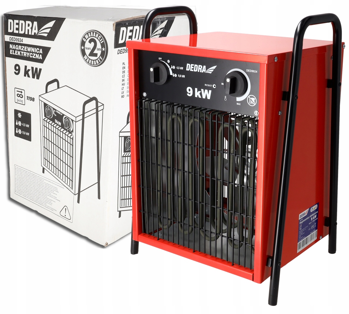 DED9924 to poręczna nagrzewnica o wadze 9,6 kg, wyposażona w wygodny uchwyt ułatwiający przenoszenie.