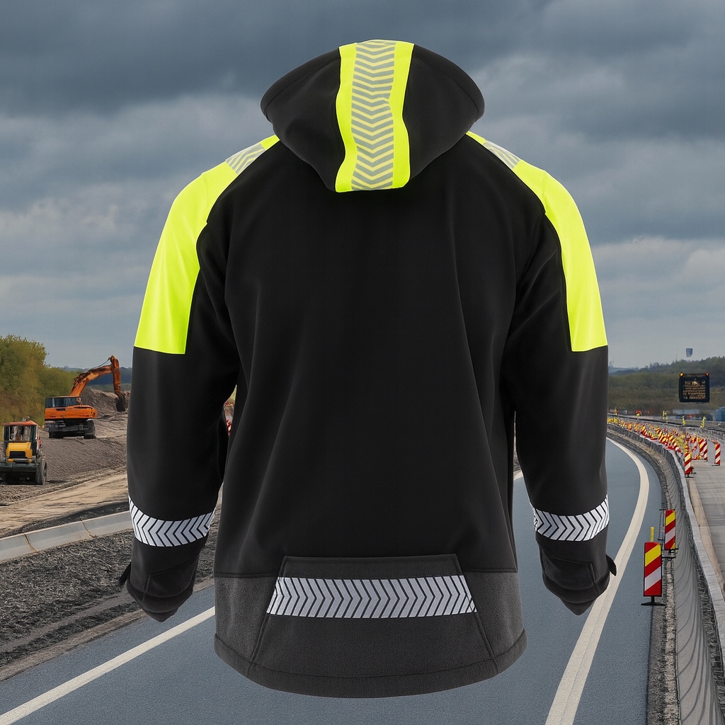 Segmentowe taśmy odblaskowe 5 cm + wstawki hi-vis rozmieszczone na całej sylwetce → jesteś widoczny z każdej strony, na placu budowy i po zmroku.
