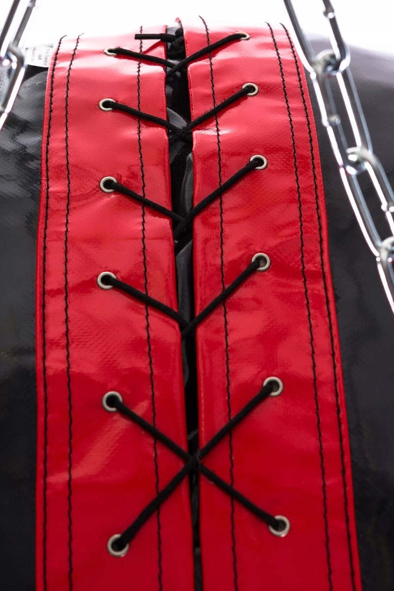Wiązania sznurowane - jest to najlepsza opcja zamknięcia worka. Wiązania są mocne, dziurki wykończone są niklowanymi nitami, które zapobiegają poszerzenia się dziurki na sznurówkę. Dodatkowo pod wiązaniem znajduje się wkładka zapewniająca szczelność worka bokserskiego - więc już nie musisz się martwić, że podczas treningu wypełnienie wysypie się na zewnątrz.