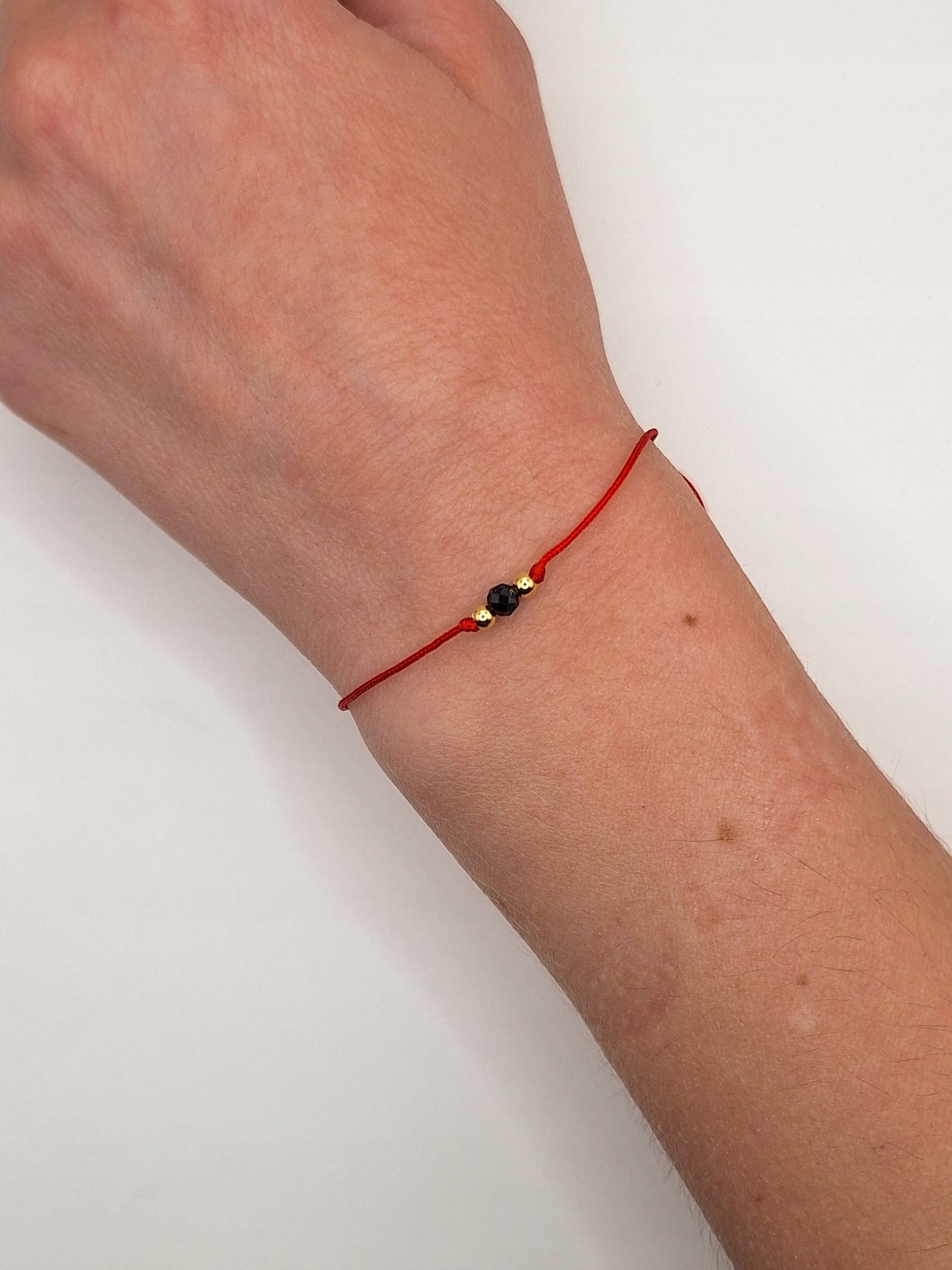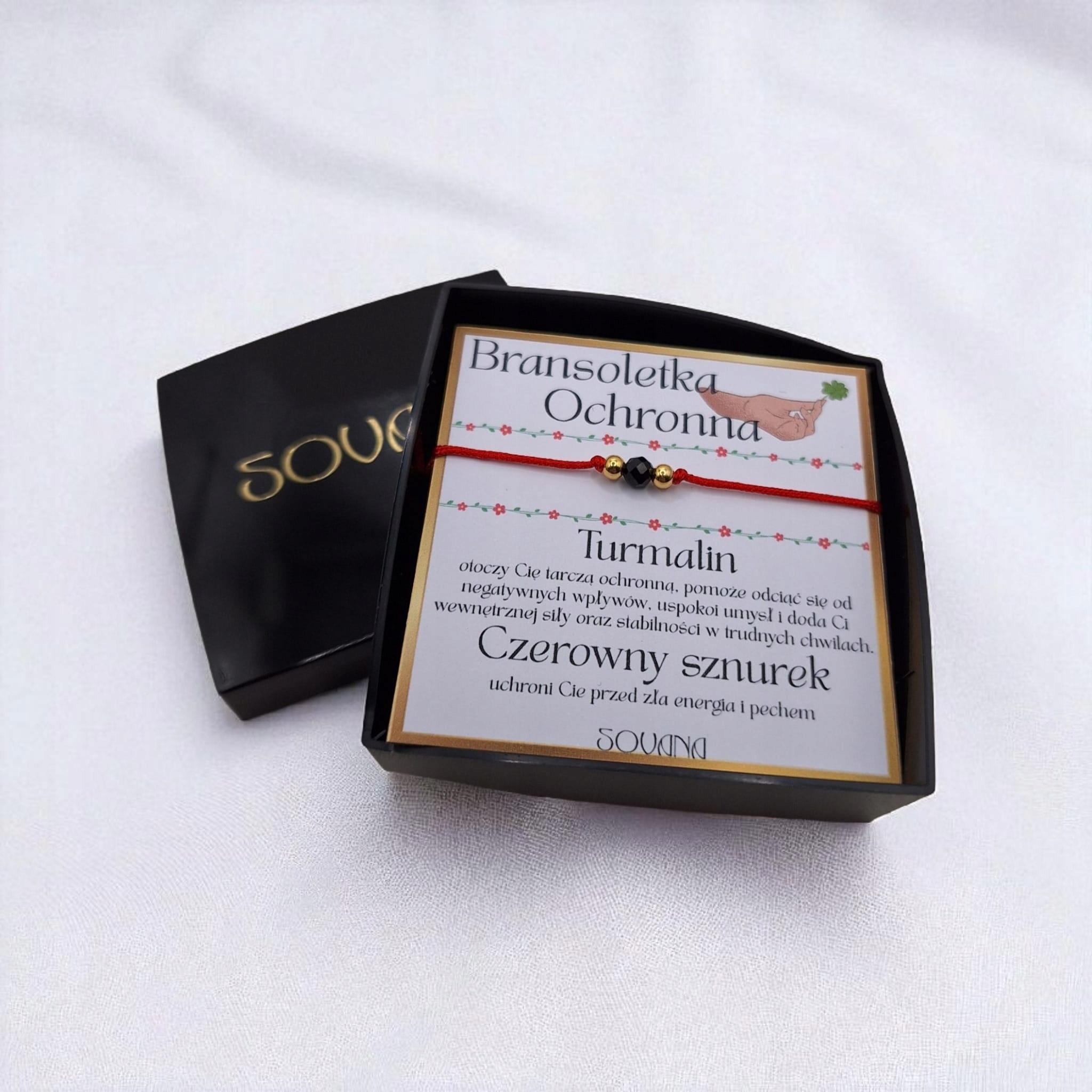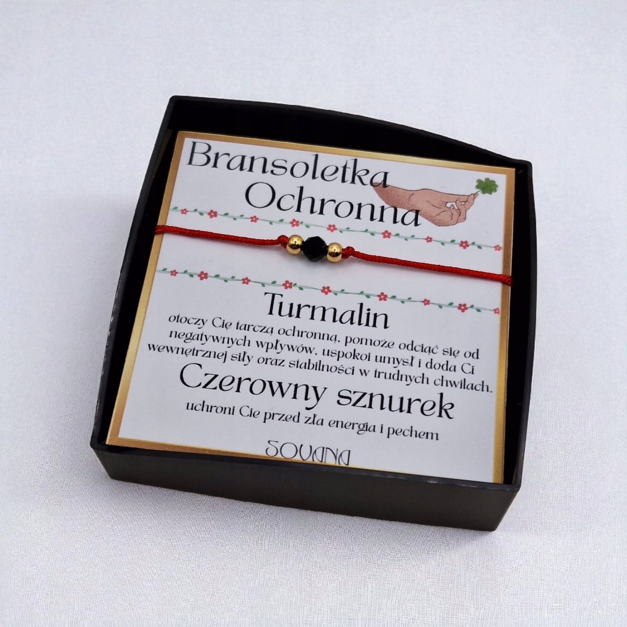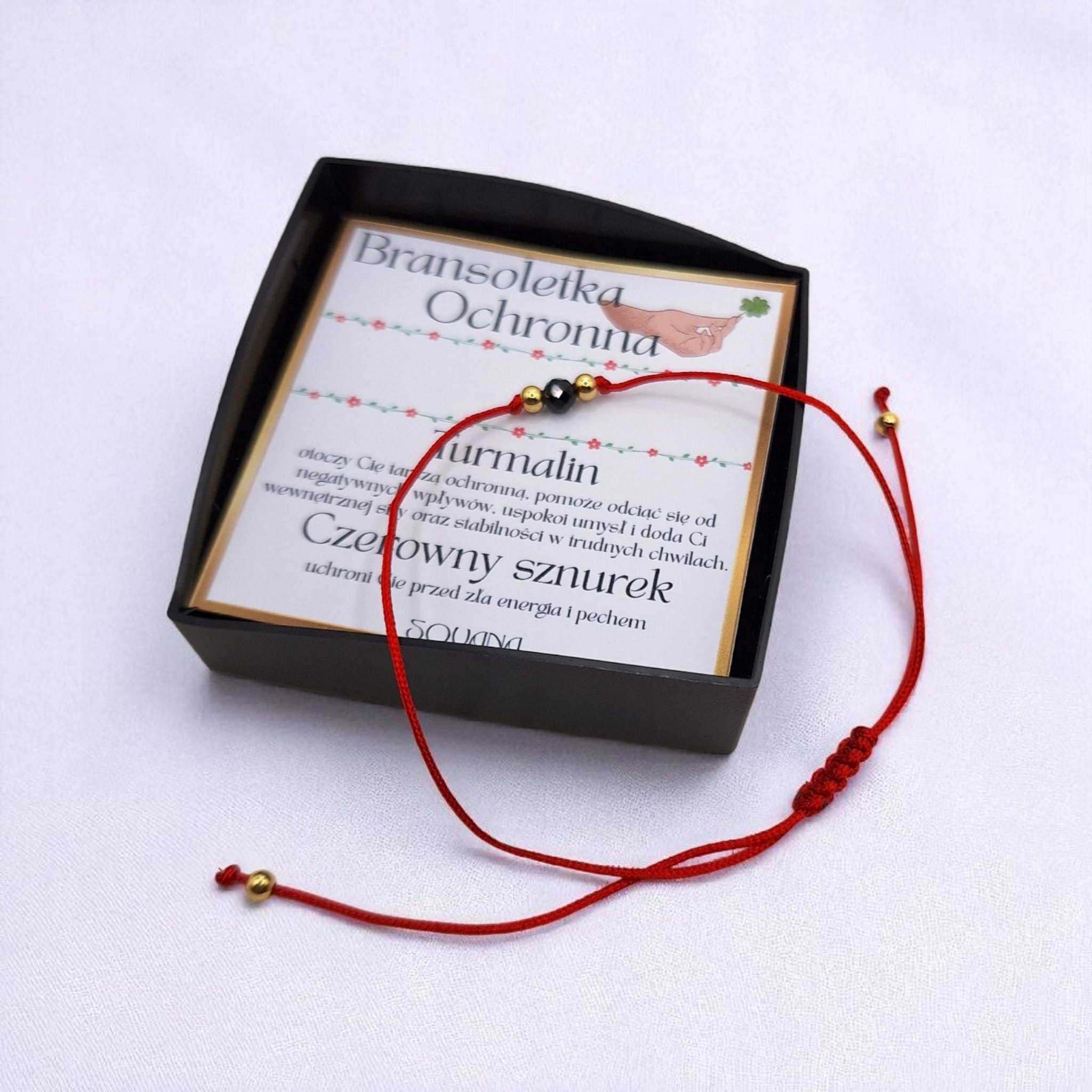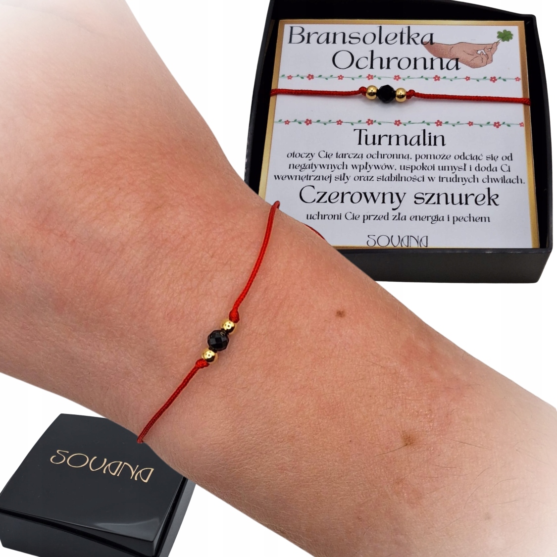 Bransoletka wykonana z trwałego czerwonego sznurka, ozdobiona naturalnym czarnym turmalinem – kamieniem silnej ochrony, uziemienia i wewnętrznej równowagi.
