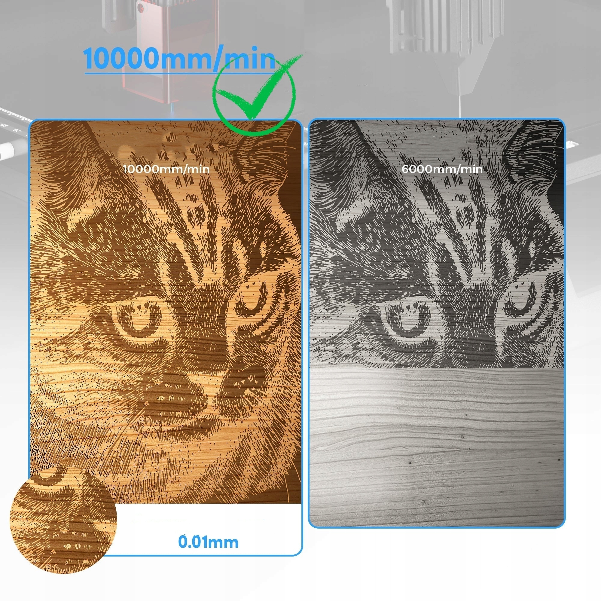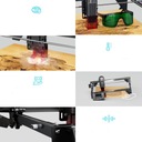 Dzięki technologii podwójnej wiązki Ray5 10W ma większą moc lasera 10 W, co zapewnia lepszą wydajność cięcia i grawerowania. Jest w stanie ciąć płytę drewnianą o grubości 0.8''/20mm i akryl 1.2''/30mm. Rozmiar graweru 15.8*15.8in(400*400mm). Max prędkość grawerowania 10000mm/min.