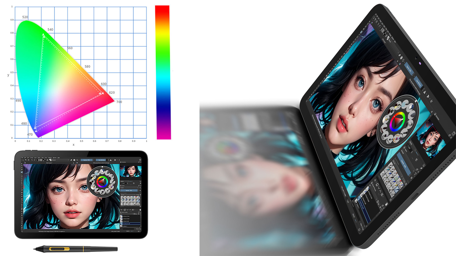 Wyświetlacz tabletu stworzony jest w technologii LCD i ma przekątną 10,1" oraz rozdzielczość 1280 px x 800 px. Jasność wyświetlacza to 250 cd/m kw., a gama kolorów to 90% sRGB. Współczynnik kontrastu wyświetlacza wynosi 1000:1, natomiast kąty widzenia to 178° (89°/89°) poziomo, (89°/89°) pionowo. Te parametry sprawiają, że tworzenie na naszym tablecie jest bezkompromisowe i spełni oczekiwania nawet profesjonalistów.