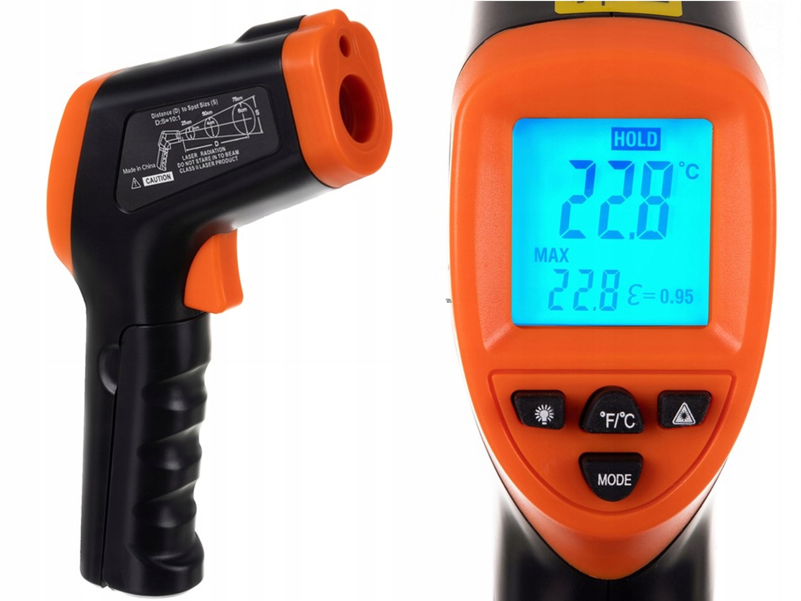 Bezkontaktowy termometr laserowy pozwala na precyzyjne zmierzenie temperatury w zakresie -50 ~ 550°C. Laserowy celownik ułatwia pracę z urządzeniem. Możliwość włączenia podświetlenia ekranu.