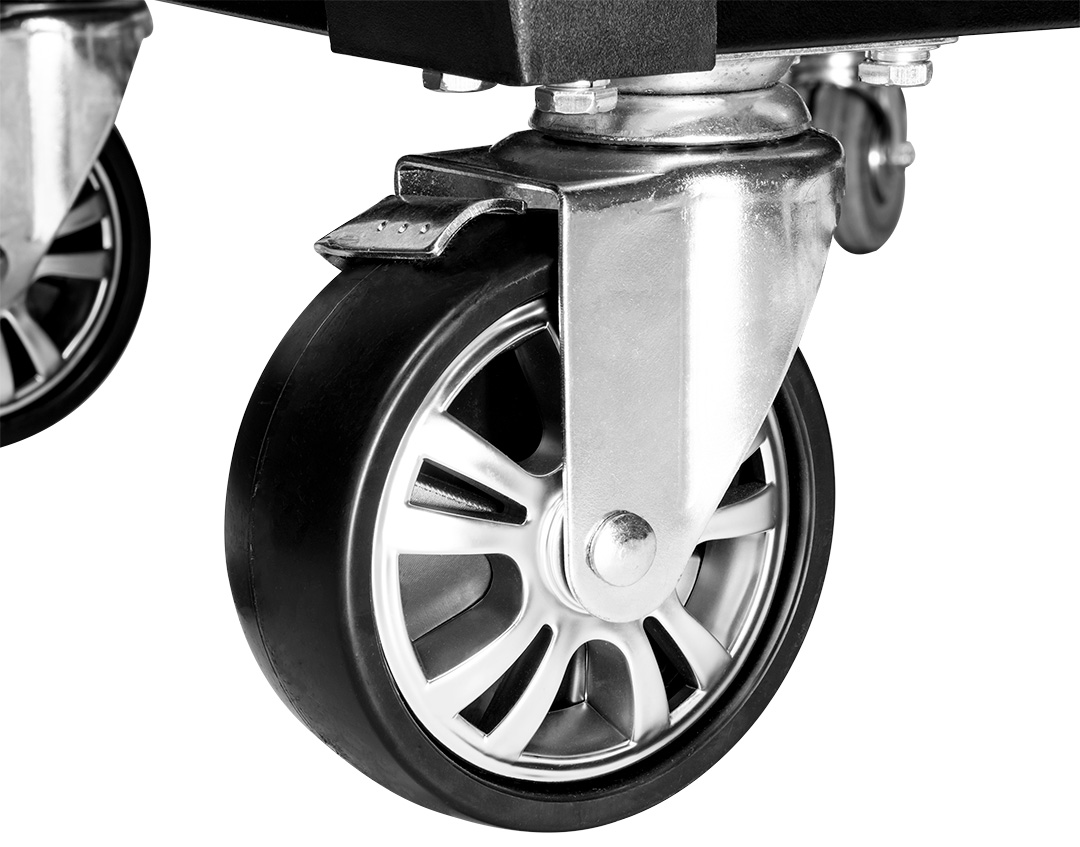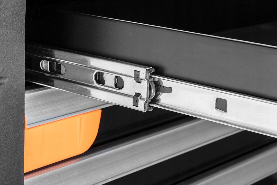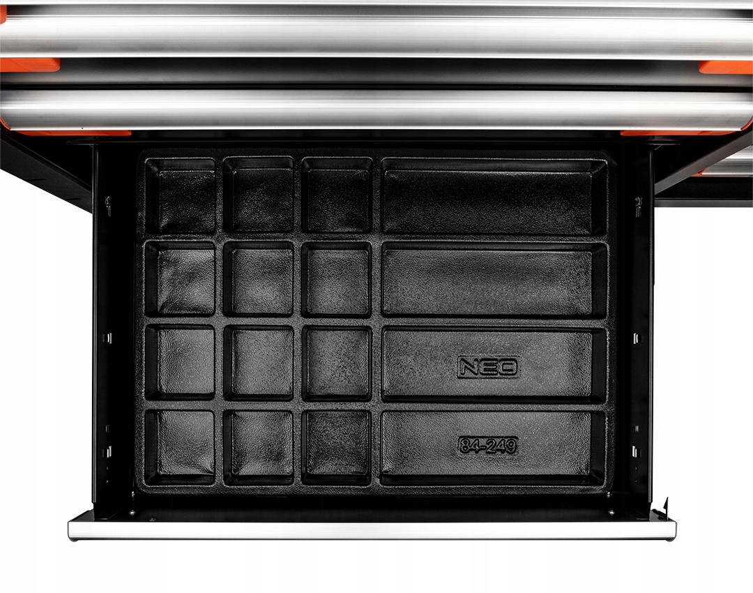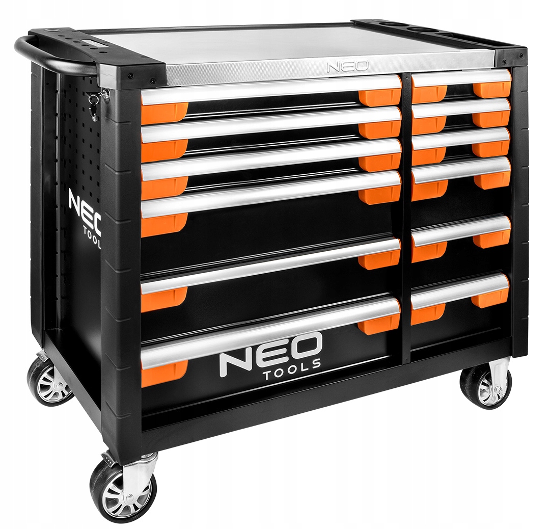 Szafka narzędziowa 12 szuflad 1105x465x825 mm (z kołami 978mm), 6 dużych w tym 3 niskie, wymiar 560 x 400 x 60 mm i 3 wysokie wymiar 560 x 400 x 139 mm, 6 małych w tym 3 niskie wymiar 252.5 x 400 x 60 mm i 3 wysokie wymiar 252.5 x 400 x 139mm, stalowy korpus, udźwig 600kg, aluminiowy blat z miejscami na wkrętaki i akcesoria, perforacja boczna na haki oraz akcesoria NEO, odbojniki narożne, uchwyt boczny, blokada szuflad, szuflady 100% otwierane, kompatybilne z wkładkami narzędziowymi Neo, prowadnice kulkowe, zamek centralny, dwa klucze, blokada kół, szuflady wyposażone w maty EVA wysokość 2mm, koła PU 5 cali. Dodatkowe wyposażenie szafki nr. ref.: 84-249, 84-247, 84-246, 84-242, 84-241, 84-240, 84-239, 84-238, 84-237, 84-236, 84-235, 84-234, 84-233, 84-232, 84-231, 84-230