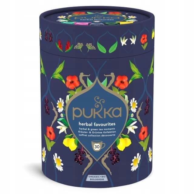 Odkryj zestaw Pukka Favourite Tea Box! Znajdziesz w nim pięknie zaprojektowany wybór najpopularniejszych herbat Pukka. Dzięki 30 torebkom herbaty w 5 pysznych smakach możesz rozkoszować się kojącym aromatem i pysznym smakiem organicznych herbat ziołowych Pukka, wytwarzanych wyłącznie z najwyższej jakości ziół organicznych i pochodzących z odpowiedzialnych źródeł.