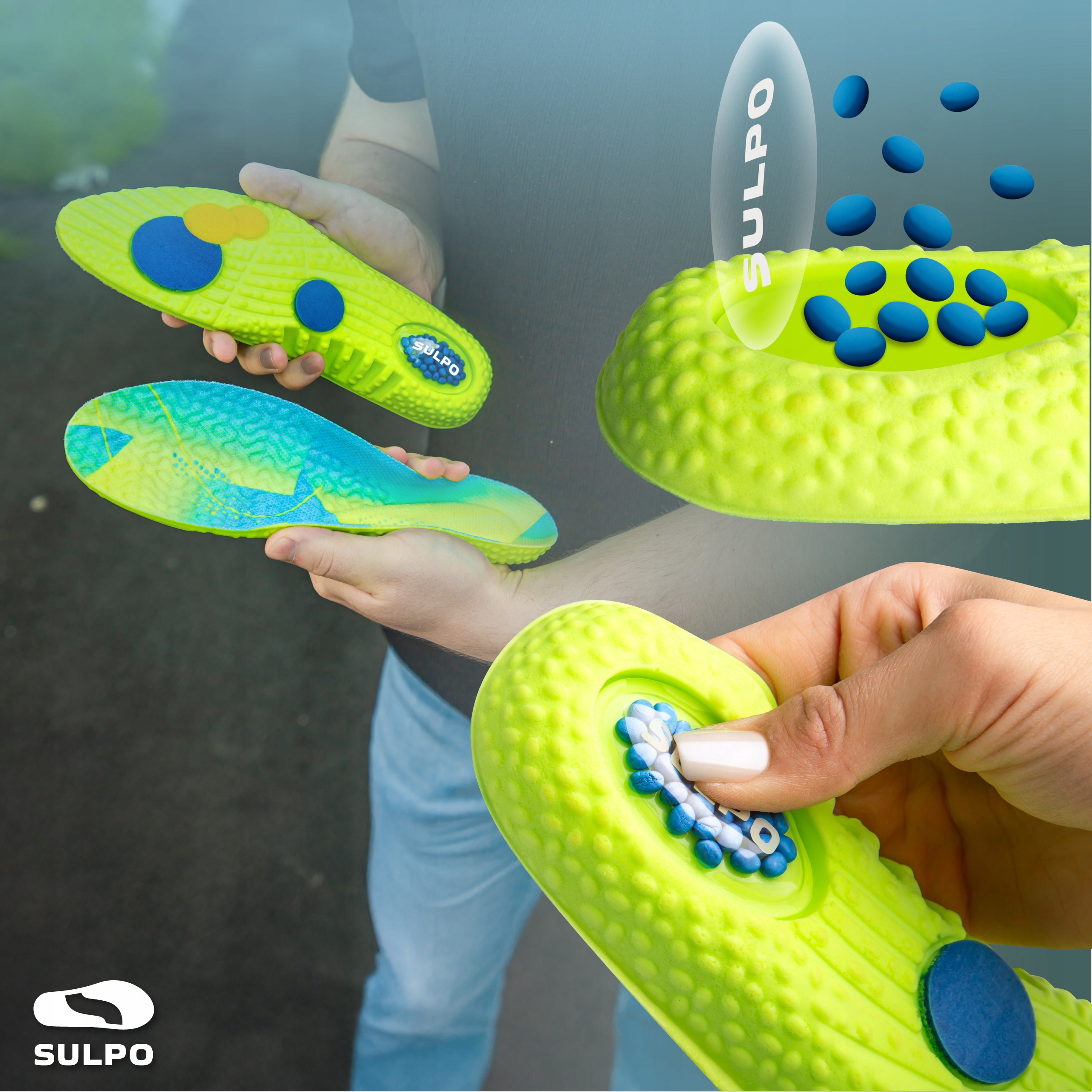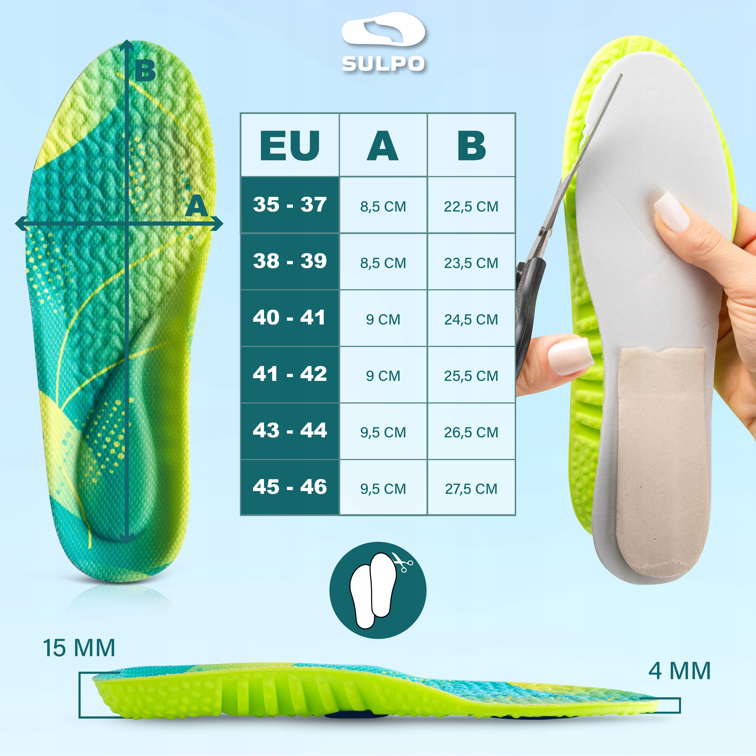 Wkładki SULPO to nowoczesne wkładki do obuwia zaprojektowane tak, aby wspierać stopy i zmniejszać obciążenia podczas chodzenia czy uprawiania sportu. Dzięki ergonomicznej konstrukcji i wysokiej jakości materiałom zapewniają skuteczną amortyzację, dobrą cyrkulację powietrza oraz możliwość łatwego przycięcia, aby idealnie dopasować je do kształtu i rozmiaru obuwia. Pasują do różnych typów butów – od sportowych po codzienne.