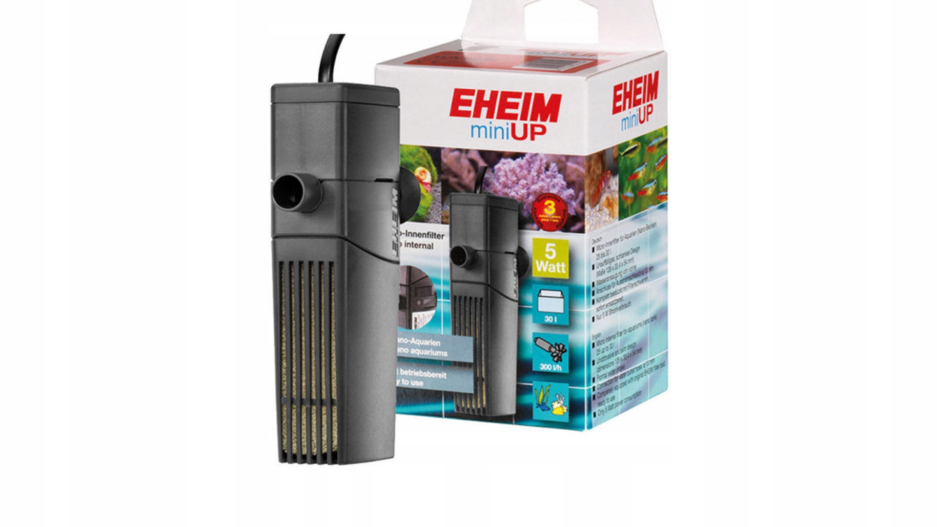 EHEIM miniUP to filtr wewnętrzny do małych akwariów (ok. 25/30 litrów) słodkowodnych i morskich. Mocowany dyskretnie na 3 przyssawki, które można łatwo odessać z szyby. Mała i smukła obudowa (33x128x54mm) pozwala ukryć filtr za ozdobami akwarium. Produkt jest bardzo wydajny (czyści 300 litrów na godzinę) i zużywa tylko 5W energii elektrycznej. Posiada długi przewód elektryczny – 180cm.