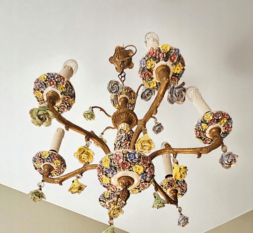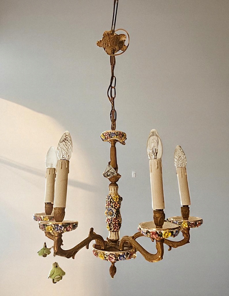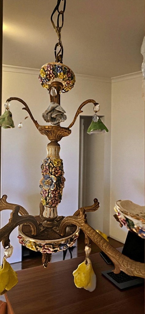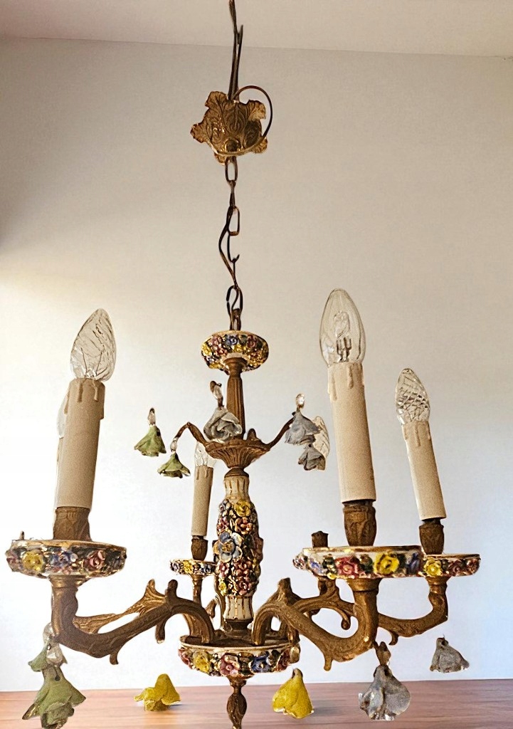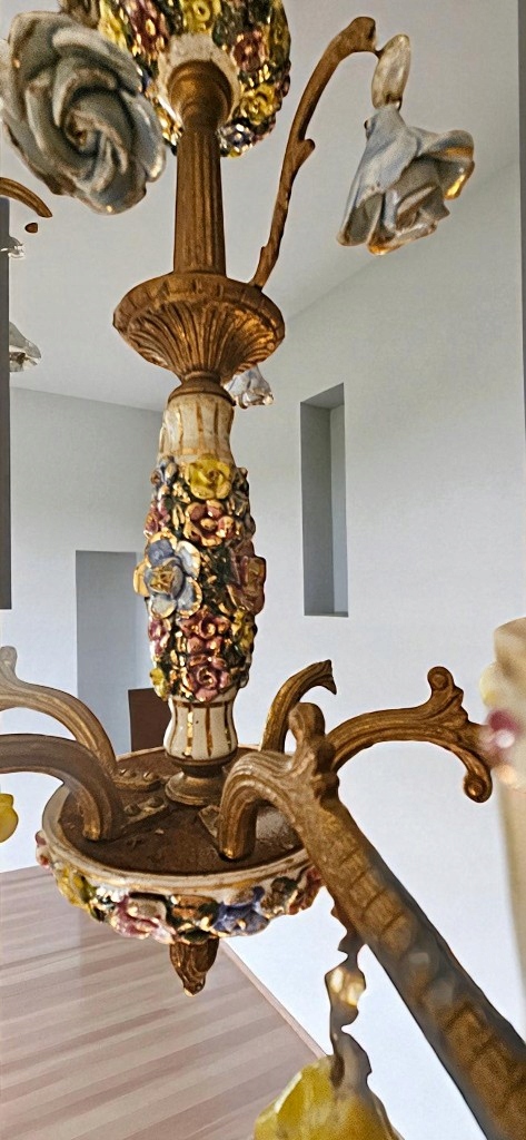 Lampa bardzo ozdobna i atrakcyjna, używana w bardzo dobrym stanie. Wykonana około 40 lat temu z mosiądzu z dodatkiem porcelany ; została przywieziona z Holandii.