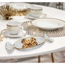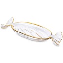 Elegancka patera w kształcie cukierka o wymiarach 3x23x10cm, łącząca nowoczesny design z ponadczasową klasyką. Jej ponadczasowy design sprawi, że będzie pasowała do każdej nowoczesnej zastawy a dzięki swojemu zdobieniu będzie bardzo widocznym dodatkiem. Szklany talerz, zdobiony złotymi akcentami, nadaje całości luksusowego charakteru. Idealna do serwowania słodyczy lub cukierków podczas spotkań rodzinnych i przyjęć. Stanowi również wyjątkowy element dekoracyjny, który doda szyku każdemu wnętrzu. Znajdzie wiele zastosowań, dlatego przyda się w każdym domu. Posiada gładką powierzchnie co ułatwia jej mycie lub czyszczenie.