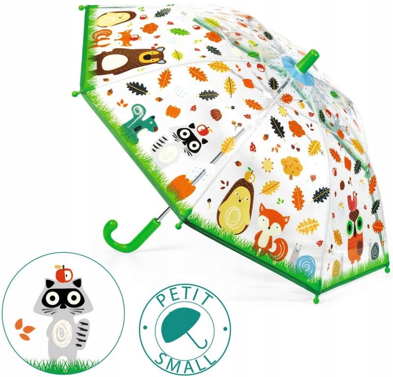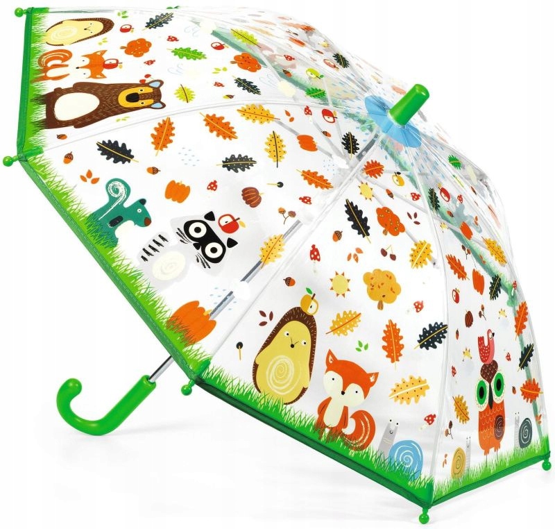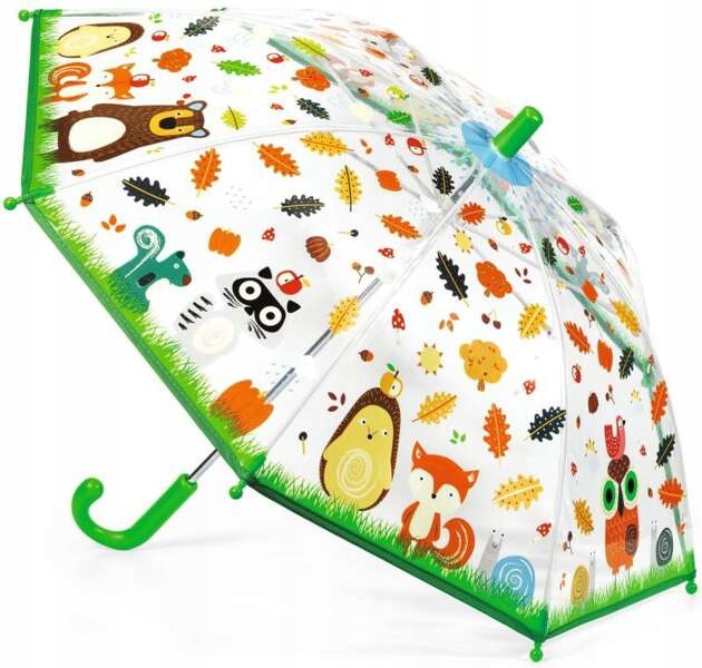 Parasol przeciwdeszczowy dla dzieci Leśne Zwierzątka Djeco to idealny prezent dla chłopca i dziewczynki, łączący funkcjonalność, bezpieczeństwo i estetyczny design. Przezroczysta czasza z grafiką przedstawiającą leśne zwierzęta oraz jesienne liście nie tylko dodaje uroku, ale także zwiększa widoczność dziecka podczas spacerów, co wpływa na jego bezpieczeństwo.