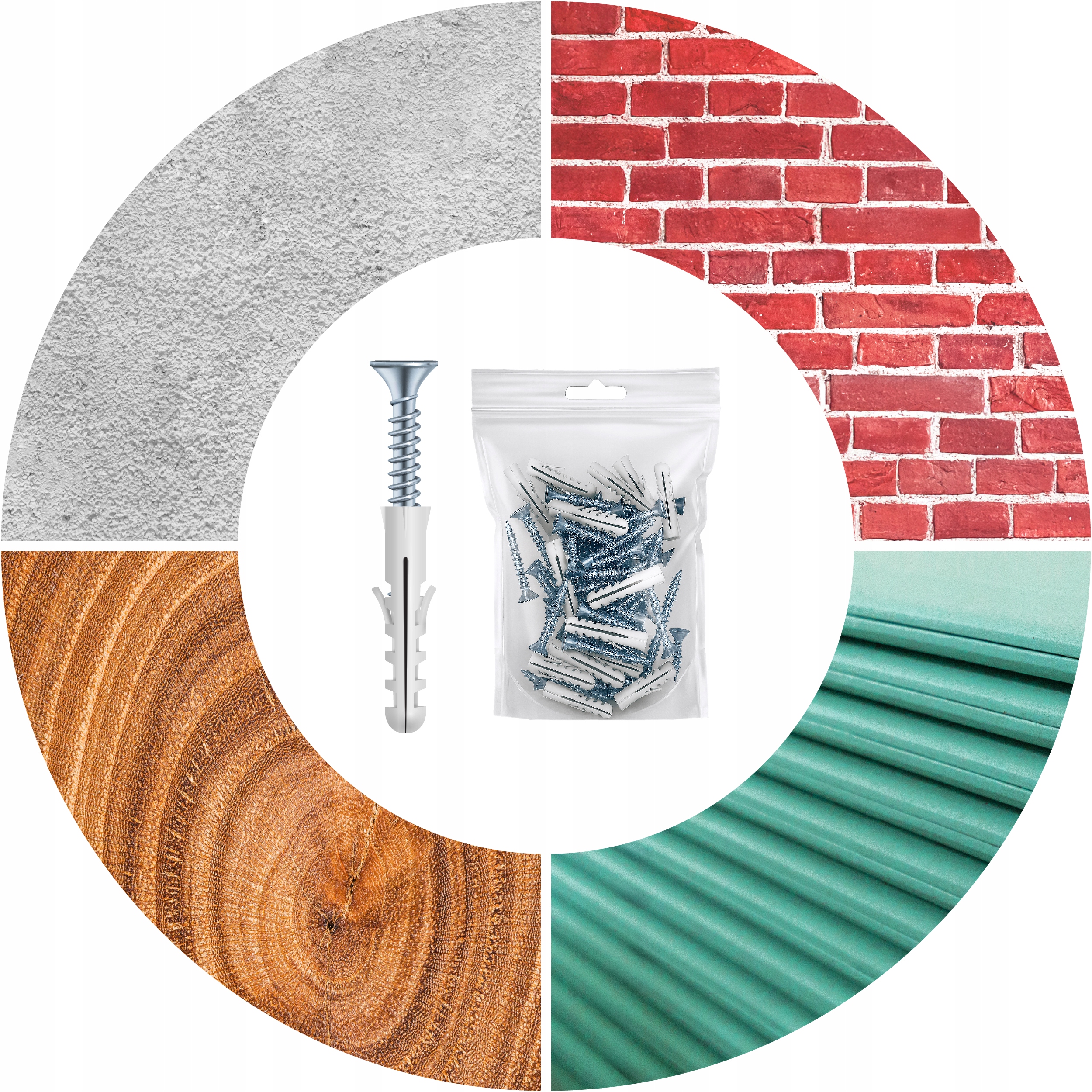Kołki rozporowe w zestawie są idealne do montażu na różnych powierzchniach, takich jak: