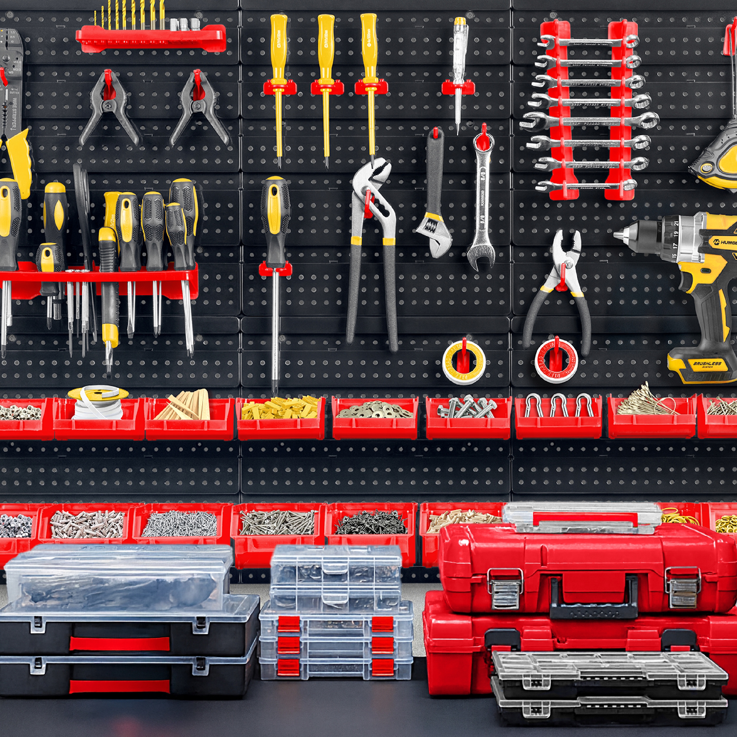 Dzięki różnym dodatkom ze wzmocnionego tworzywa zmieścisz na niej komplet narzędzi. Wygodnie chwyć i odłóż na miejsce po pracy.