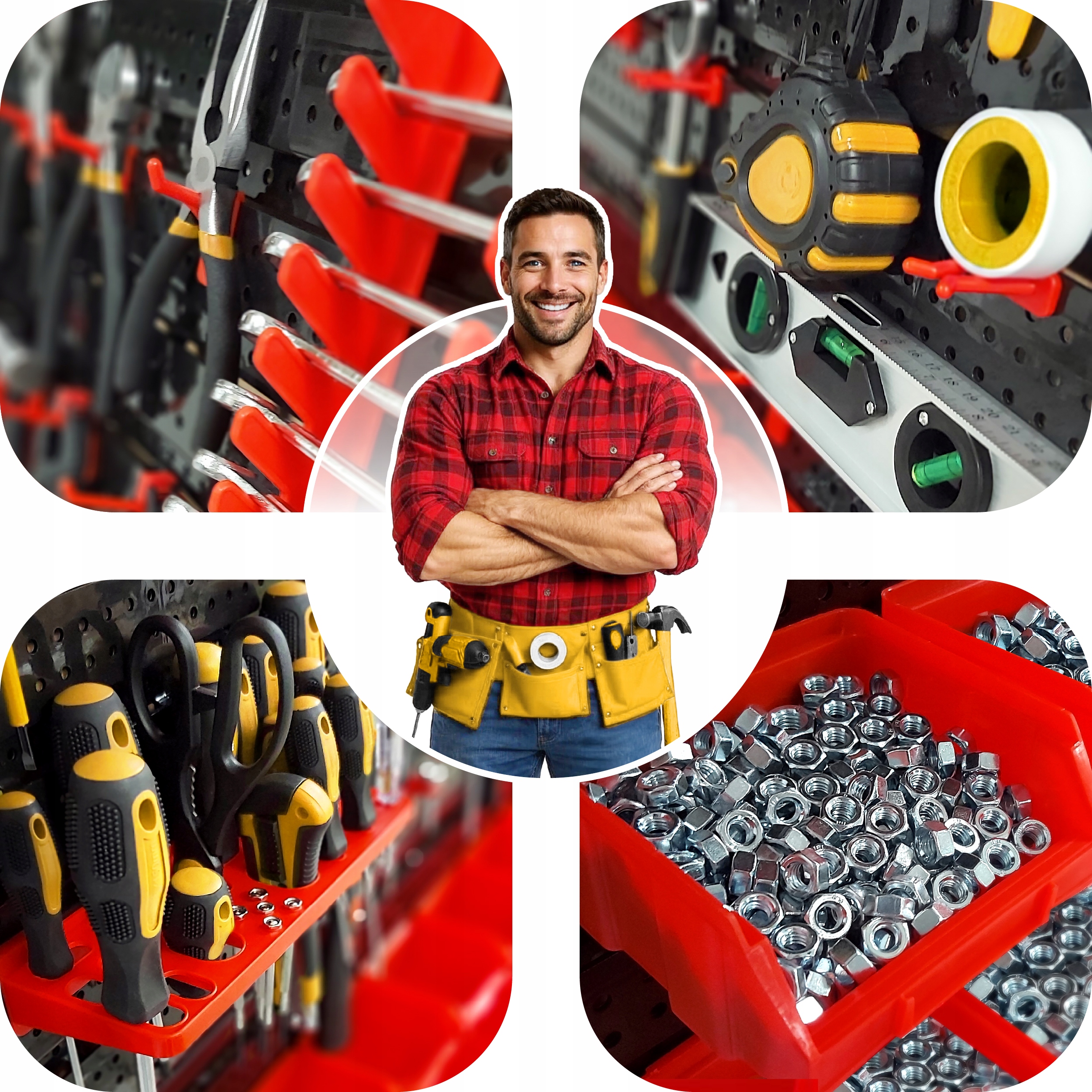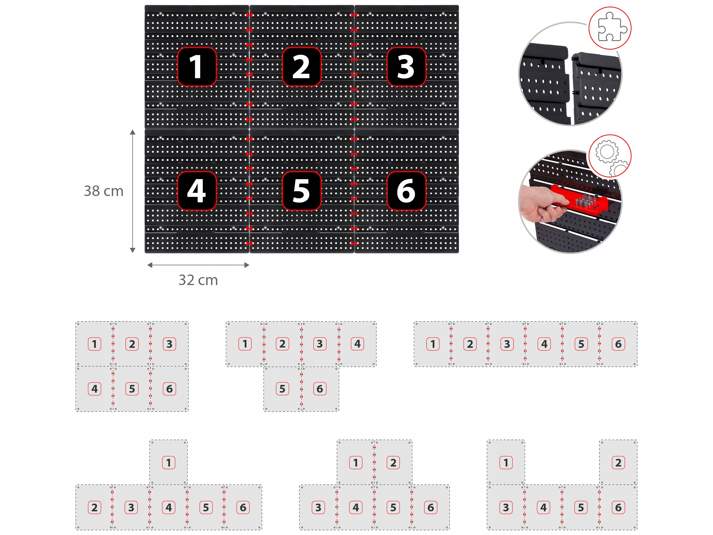 Tablica narzędziowa posiada modułową konstrukcję, dzięki której możesz dowolnie łączyć panele i dostosować układ do swoich potrzeb. Prosty montaż pozwala na szybkie i wygodne połączenie poszczególnych elementów, a różnorodne kombinacje zapewniają elastyczność w organizacji przestrzeni roboczej.