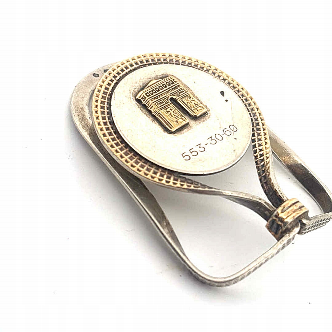 ☑️Elegancki, składany uchwyt klips do pieniędzy, wykonany z srebra z centralnym zdobieniem ze złota. W centrum umieszczono relief przedstawiający słynny Łuk Triumfalny – jeden z najbardziej rozpoznawalnych symboli Paryża, co czyni przedmiot zarówno praktycznym akcesorium, jak i stylową pamiątką z podróży.