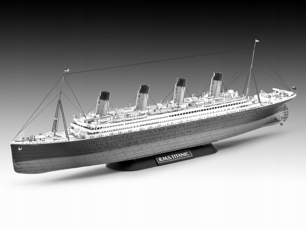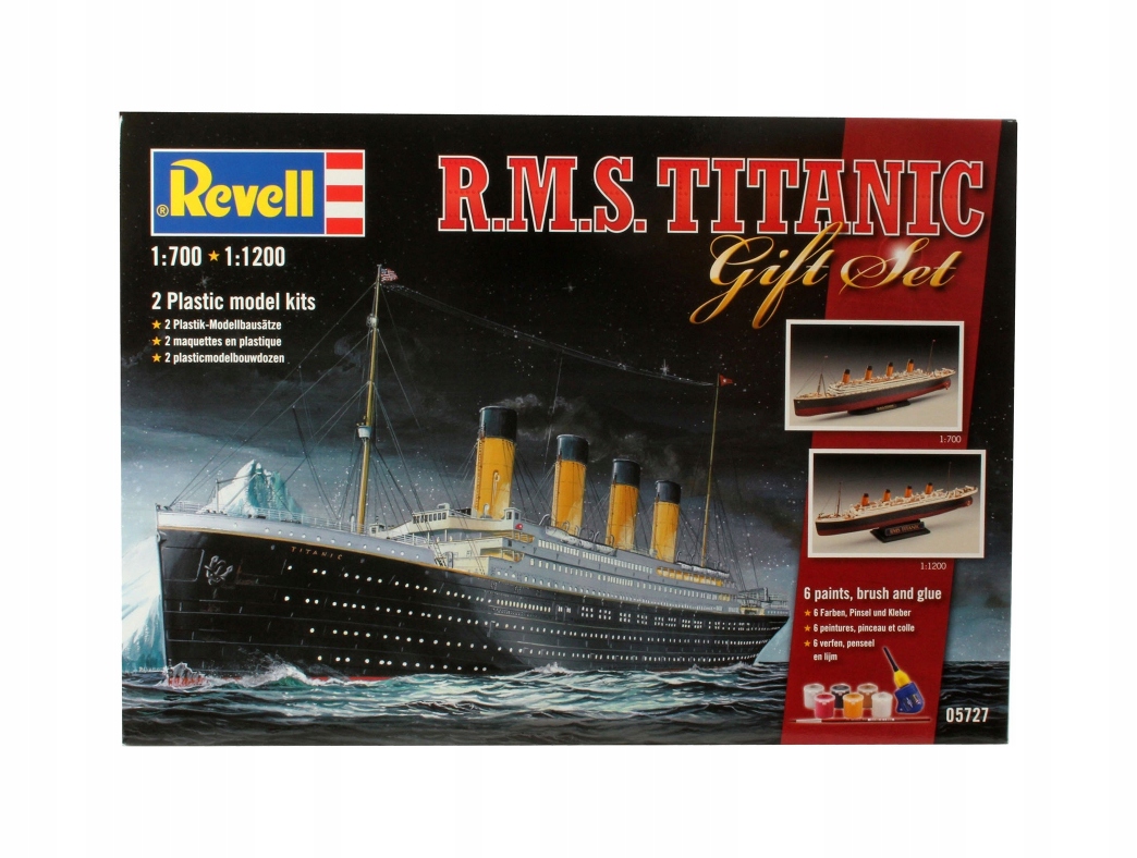 Zestaw upominkowy z dwoma modelami R.M.S. Titanic w skali 1:700 i 1:1200. Oprócz sześciu podstawowych kolorów farbek w zestawie znajduje się również klej i pędzel.R.M.S. Titanic to brytyjski transatlantyk typu Olympic, należący do towarzystwa okrętowego White Star Line. Podczas swojego dziewiczego rejsu z Southampton do Nowego Jorku zderzył się 14 kwietnia 1912 roku z górą lodową i zatonął.Cechy zestawu:Łatwy w budowie dzięki sprężystości komponentówSzczegółowo odwzorowany kadłub z widoczną strukturą materiałuTrzy śruby okrętoweSzczegółowe pokłady z drewnianą strukturą desekNadbudówki pokładowe z oknamiŁodzie ratunkoweDźwigi towaroweSzczegółowe kominyPodstawka ekspozycyjnaSzczegółowe kalkomanie