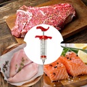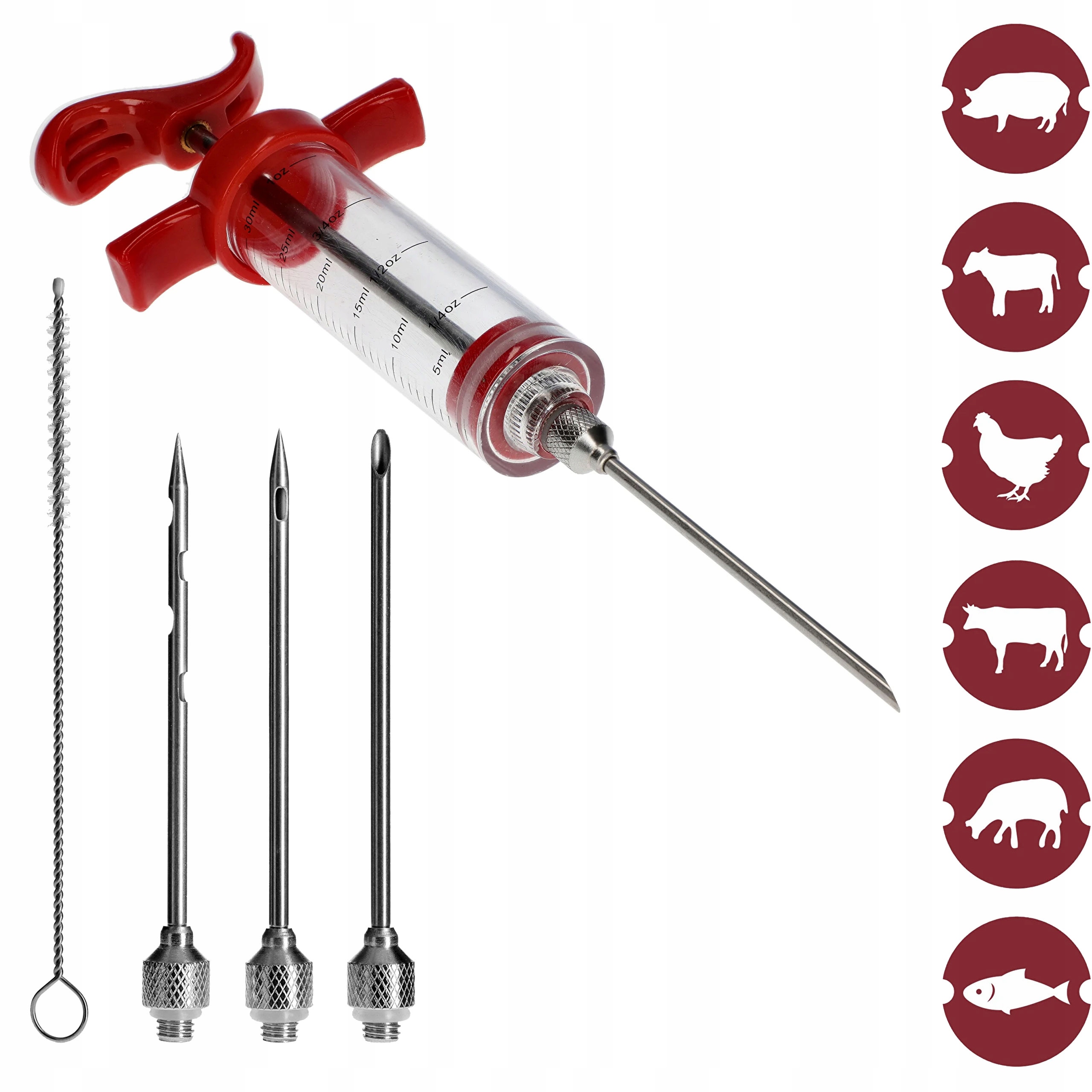 W zestawie trzy różne igły dozujące: jedna z szerokim wylotem na końcu ostrza, druga z otworem bocznym, a trzecia z czterema otworami bocznymi. Igieł z otworami bocznymi używaj do nastrzykiwania większych sztuk mięsa.