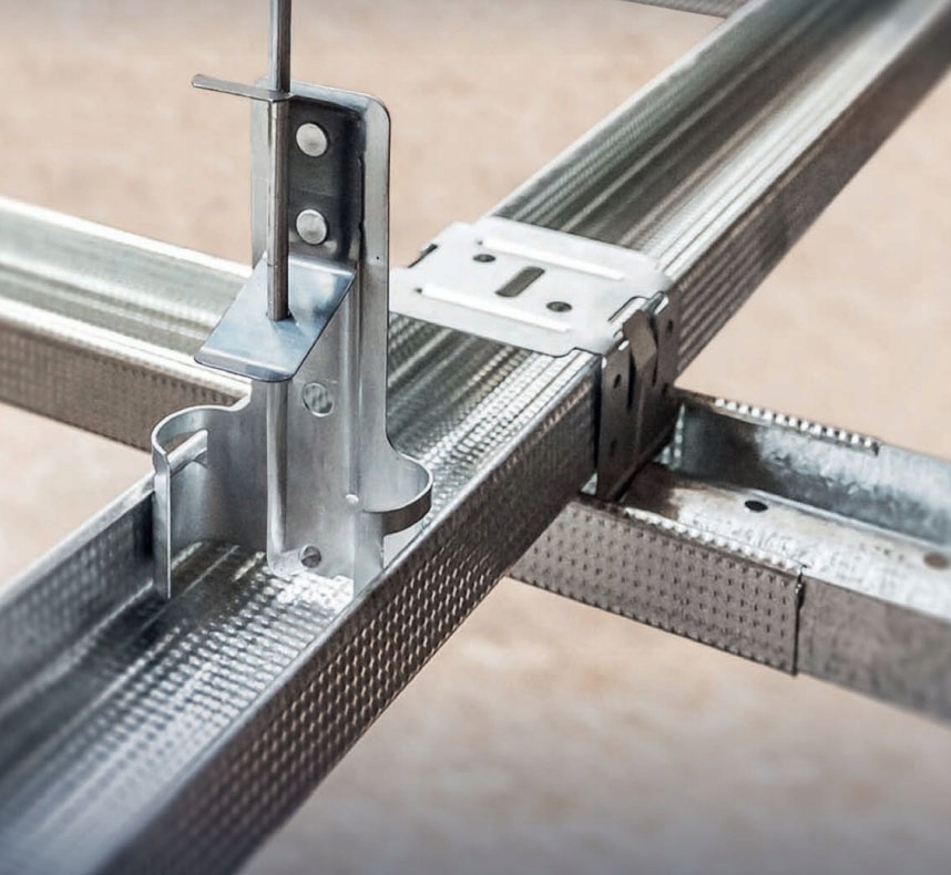 Łącznik krzyżowy CD60 umożliwia prostopadłe połączenie dwóch profili CD60, stosowany w rusztach krzyżowych sufitów podwieszanych – kluczowy element dla stabilnej, precyzyjnej konstrukcji GK: