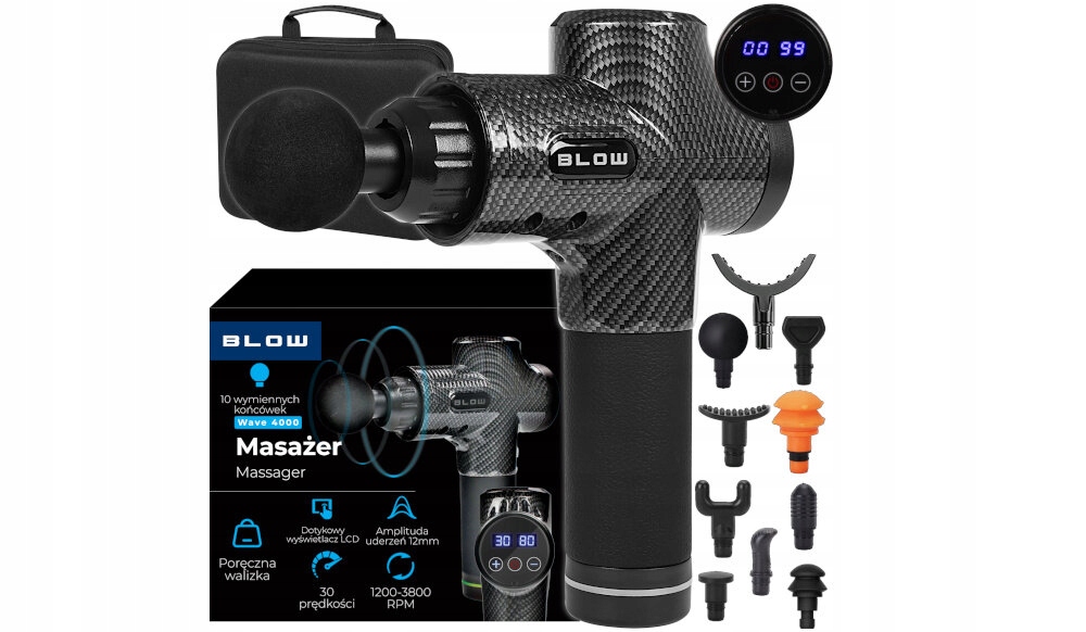 Masażer BLOW Wave 4000 44-340, 10 wymiennych końcówek, walizka, przewód USB-A/USB-C, uszczelki do głowic, dokumentacja.