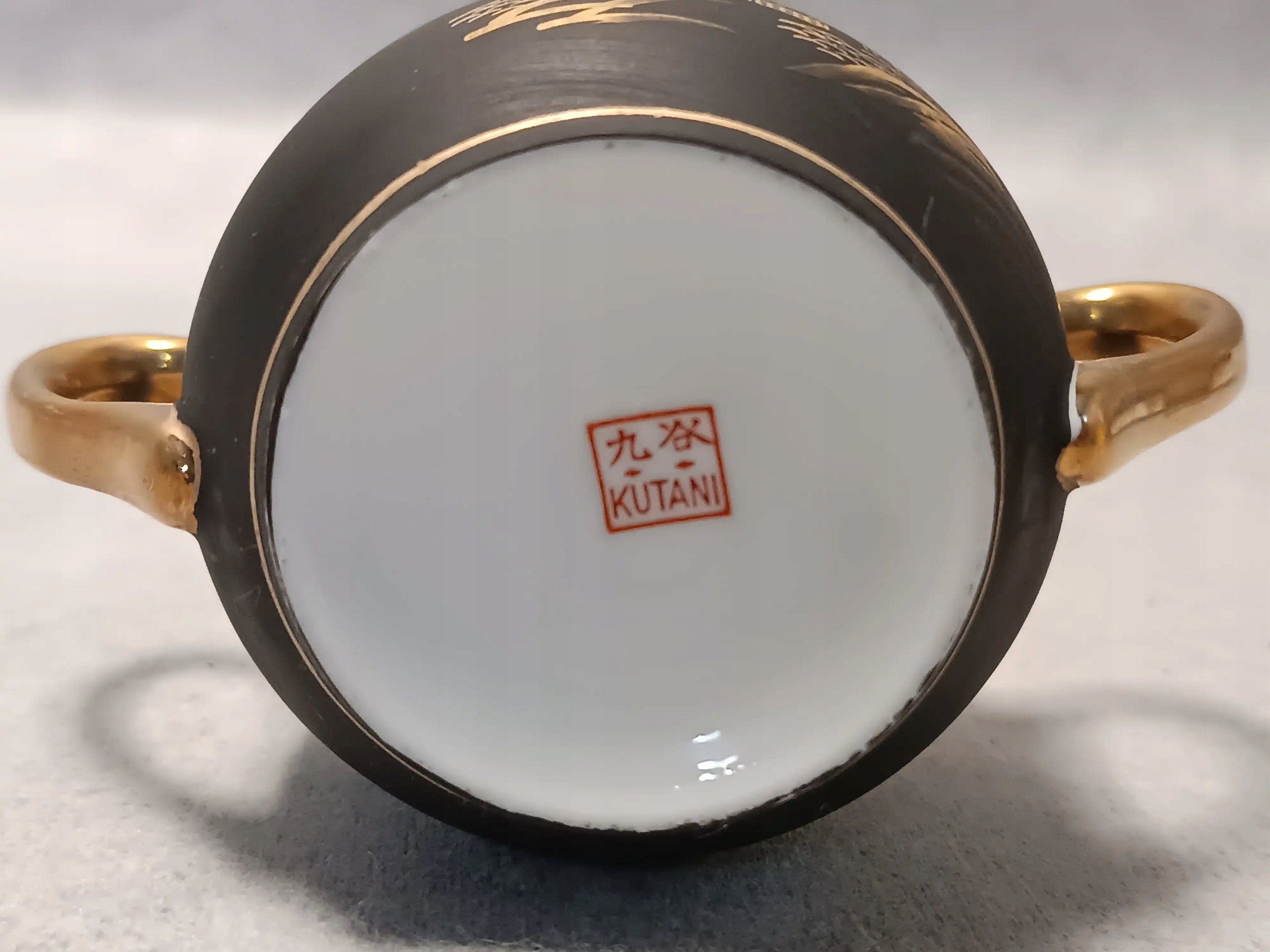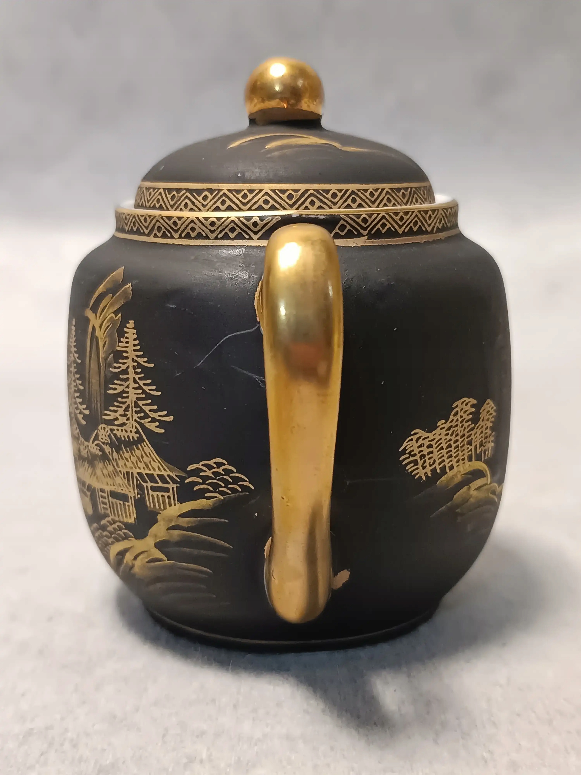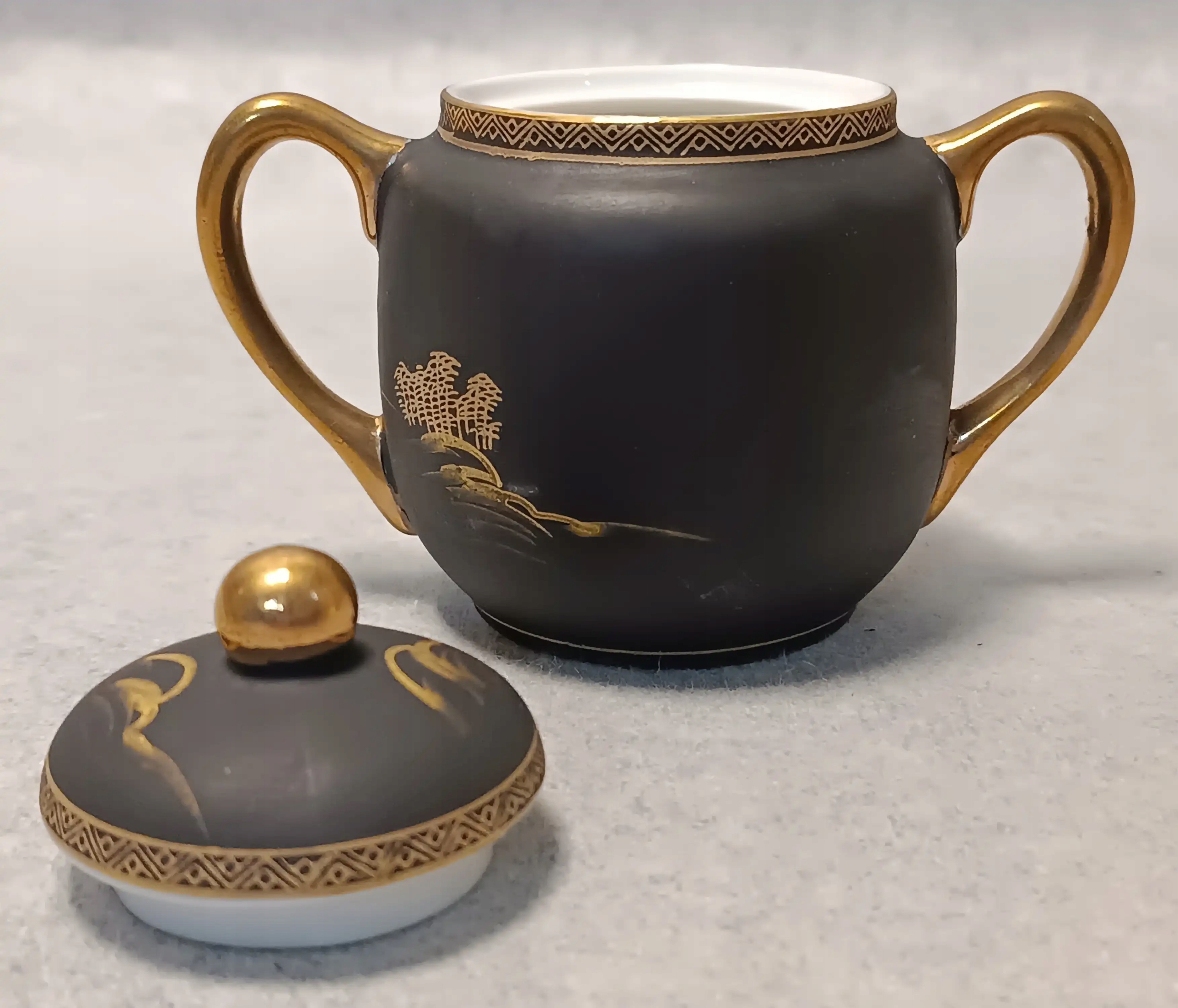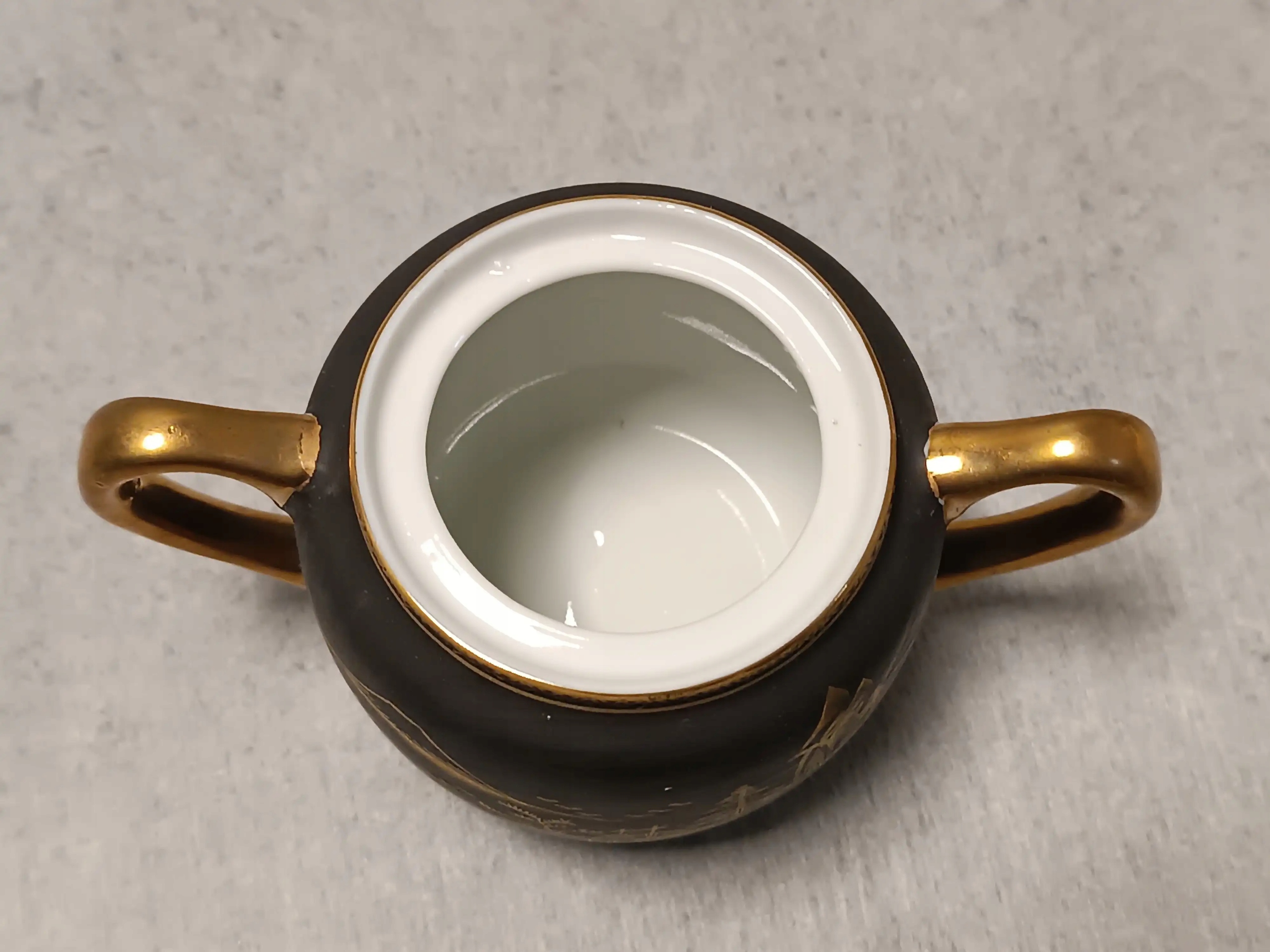 Wykonana jest z porcelany, w kolorze matowej czerni z bogatymi złotymi dekoracjami.
