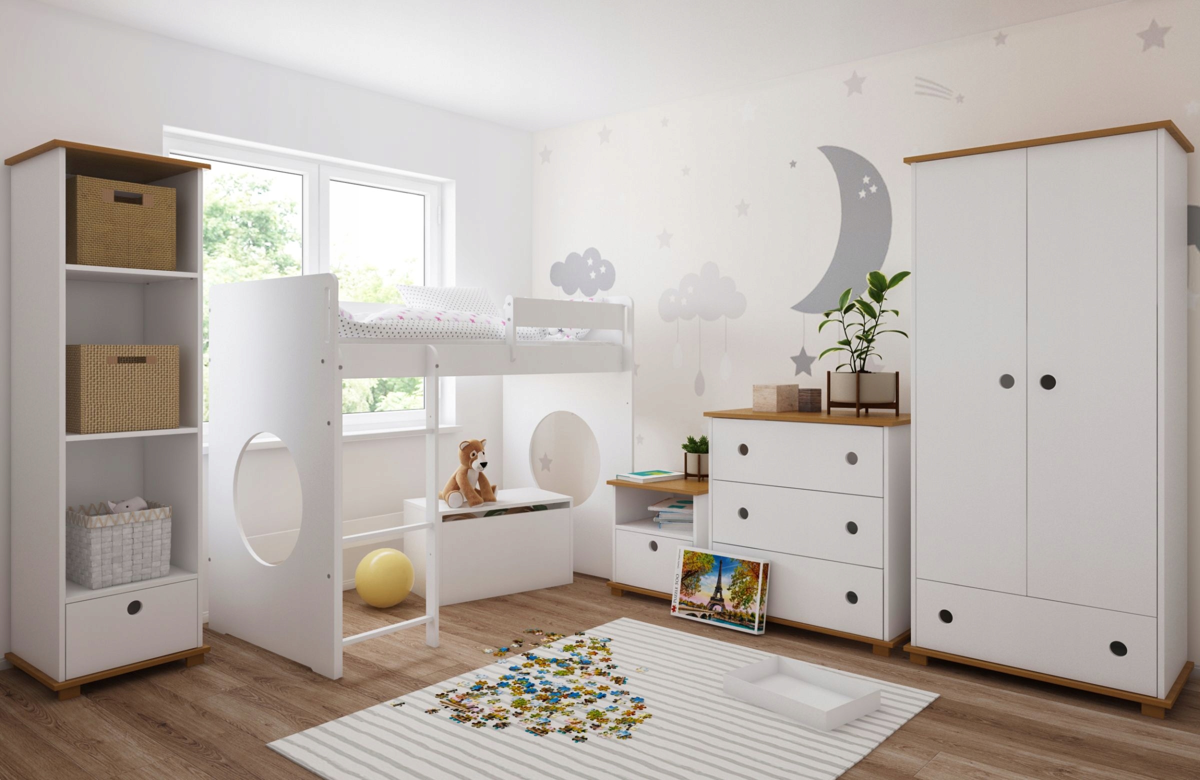 Szafka nocna KÓŁKA została zaprojektowana z myślą o harmonii, bezpieczeństwie i delikatnym wzornictwie, które wprowadza do pokoju dziecka spokój oraz przytulny klimat. W skład kolekcji KÓŁKA wchodzą również pasujące stylistycznie: szafa, komoda, biurko oraz regał – razem tworzą funkcjonalną i estetyczną przestrzeń dla Twojego malucha.