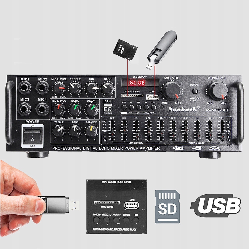 🎵 Wyposażony w 5-pasmowy mikser EQ, pogłos, trymer, balans, kartę SD i interfejs USB.