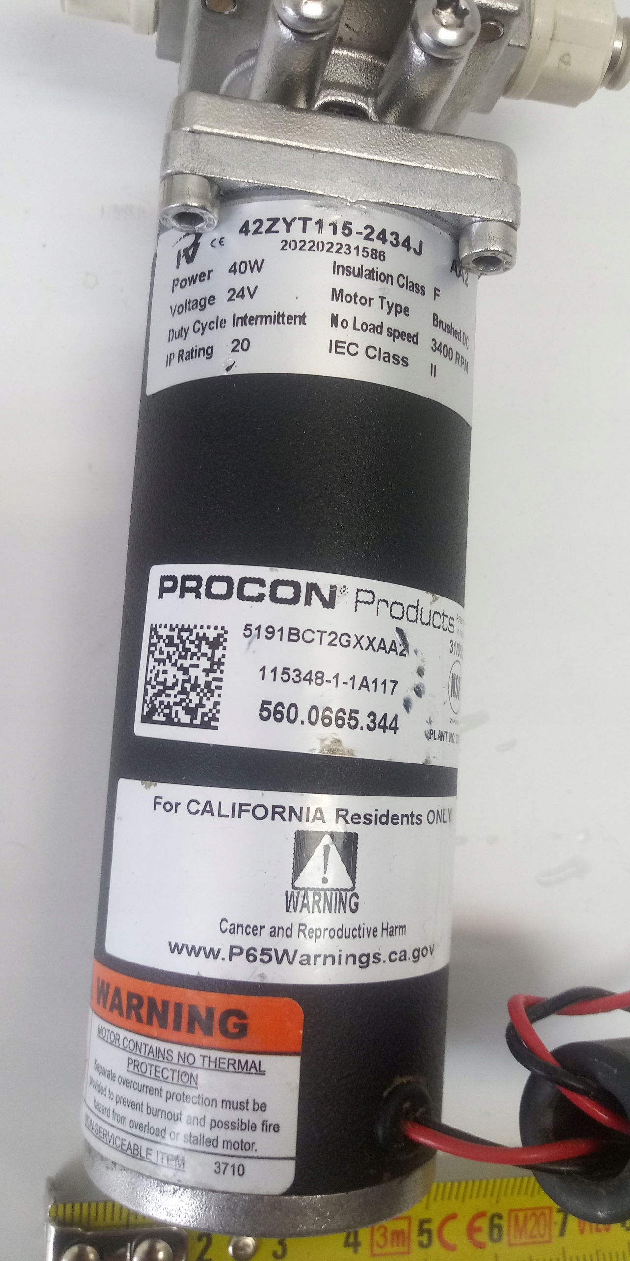Zębata pompa kwasoodporna Procon 42ZYT115-2434J, zasilana napięciem 24V DC, o wydajnosci 0,75L/min bez obciążenia, ciśnienie wyjsciowe do 12bar, przeznaczona do spożywki, przetestowana sprawna