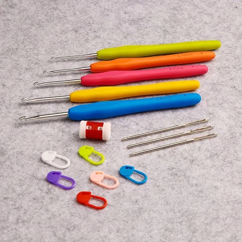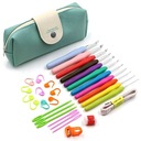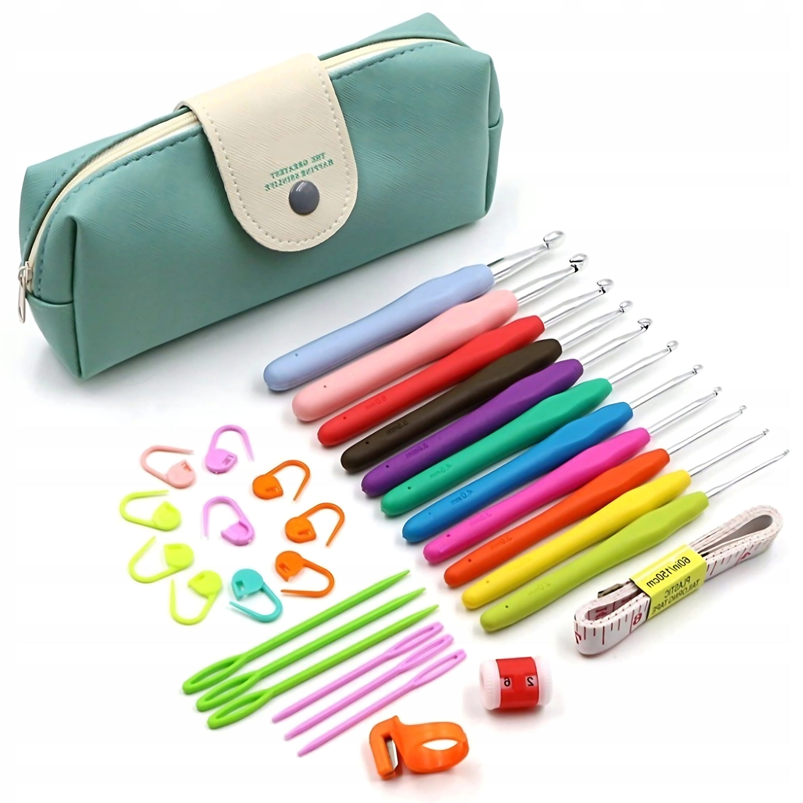 W komplecie znajdziesz nie tylko różne rozmiary szydełek, ale także igły, znacznik rzędów, licznik, pierścień do przecinania nici, centymetr i inne pomocne narzędzia.