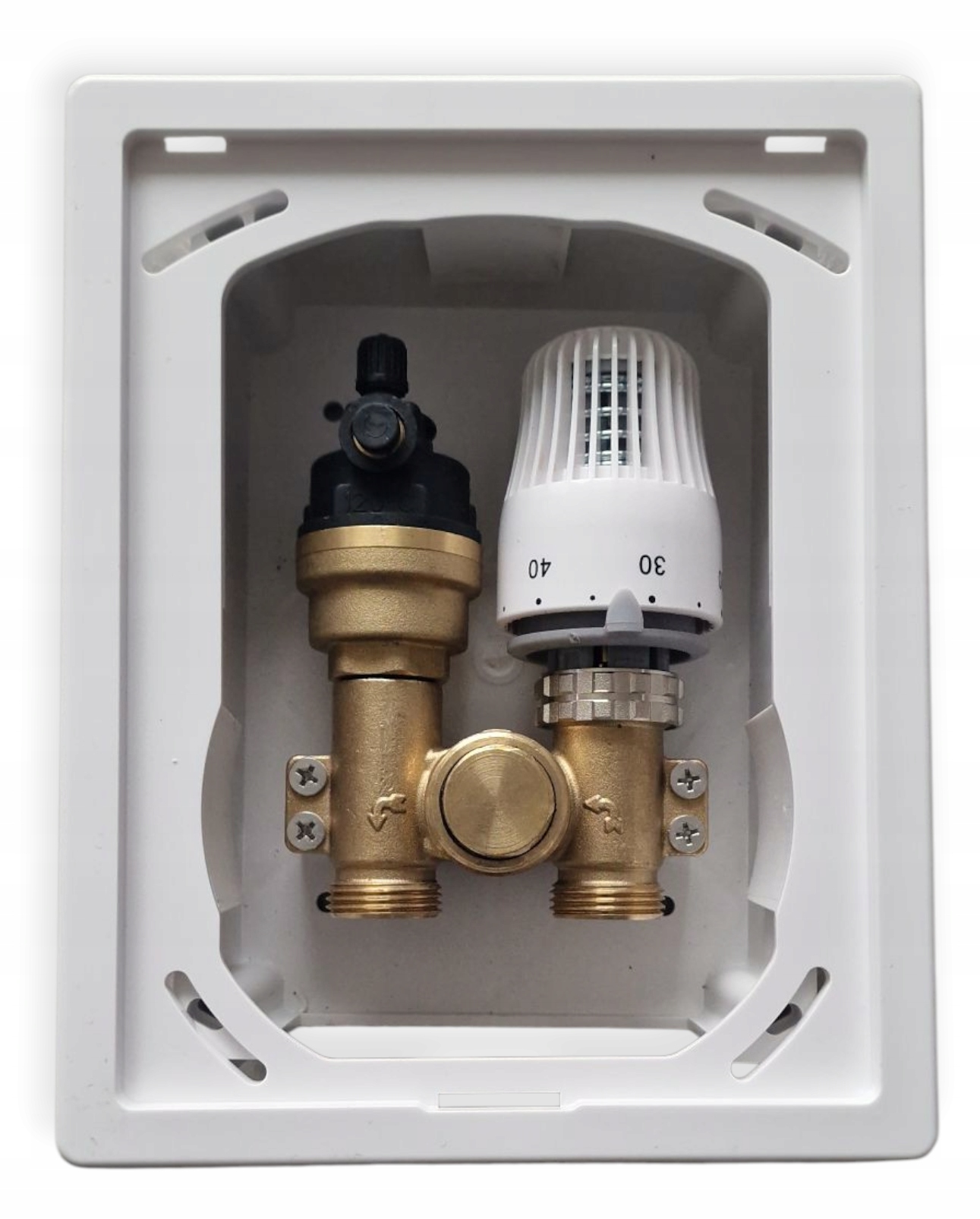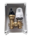 Kasetowy zawór z ograniczeniem temperatury do ogrzewania podłogowego.Montowany w instalacji na powrocie w estetycznej skrzynce z frontem plastikowym zarówno w ścianie jaki i w stelażach oraz płytach GK.