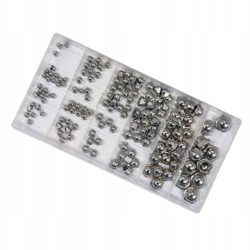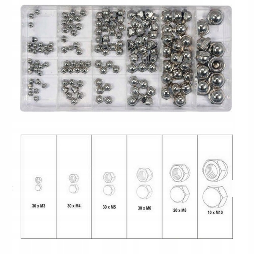 Zestaw 150 sztuk nakrętek metrycznych kołpakowych/zamkniętych. Zestaw zawiera rozmiary M3, M4, M5, M6, M8, M10. Całość umieszczono w wygodnym opakowaniu typu "sortownik".