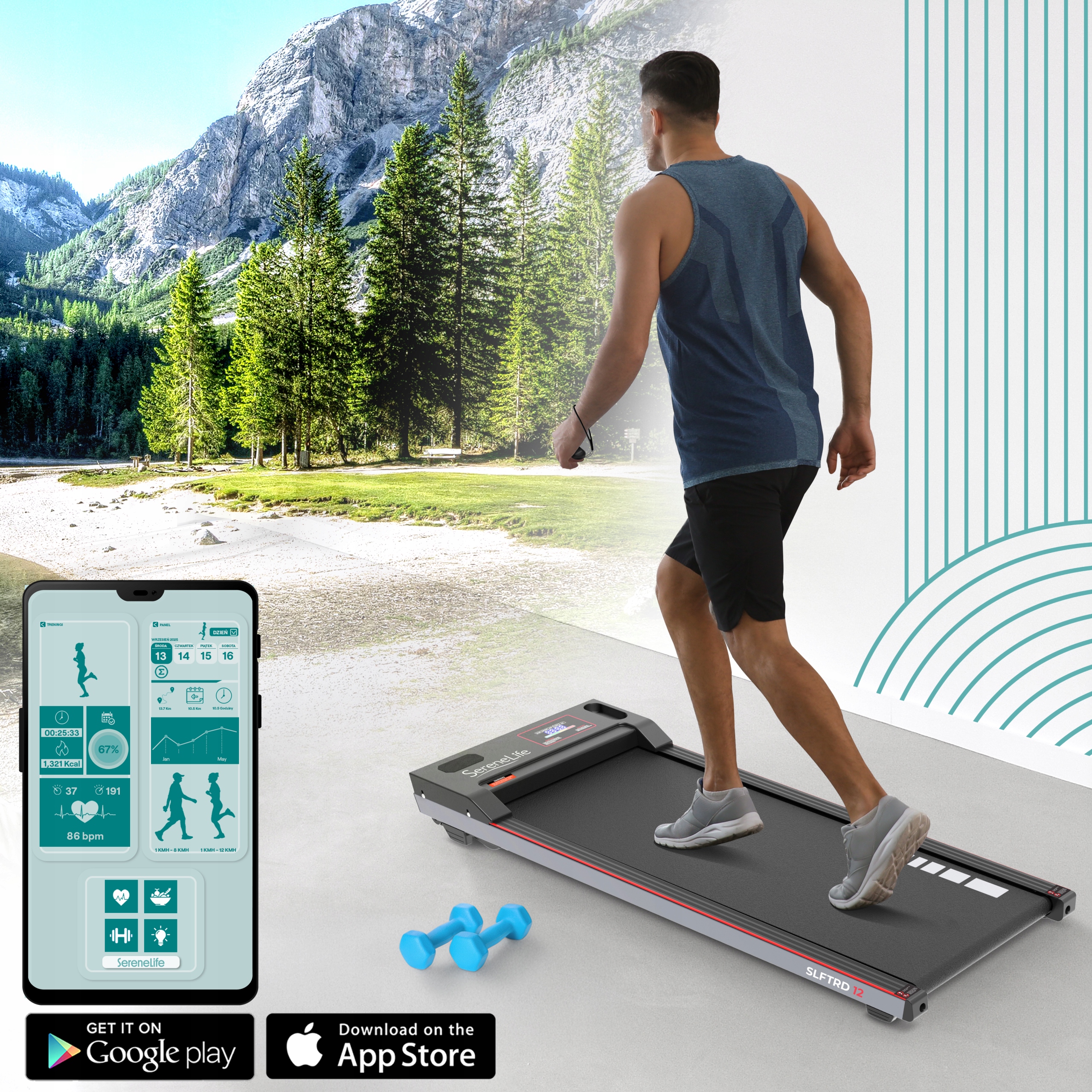 Bieżnia 2w1 – wybierz spacer w tempie 1 km/h albo lekki jogging z prędkością do 8 km/h (0,6–5 mph). Kolorowy wyświetlacz LED pokazuje czas, dystans, spalone kalorie i pozwala łatwo śledzić postępy.