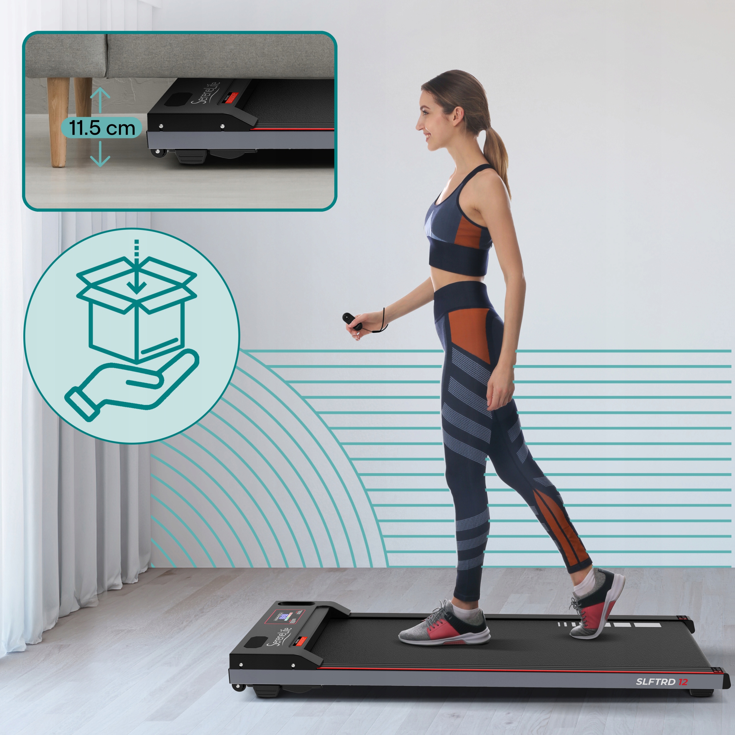 Tak, kompaktowa wysokość (ok. 11,5 cm) sprawia, że bieżnia świetnie sprawdza się jako „under desk treadmill”.