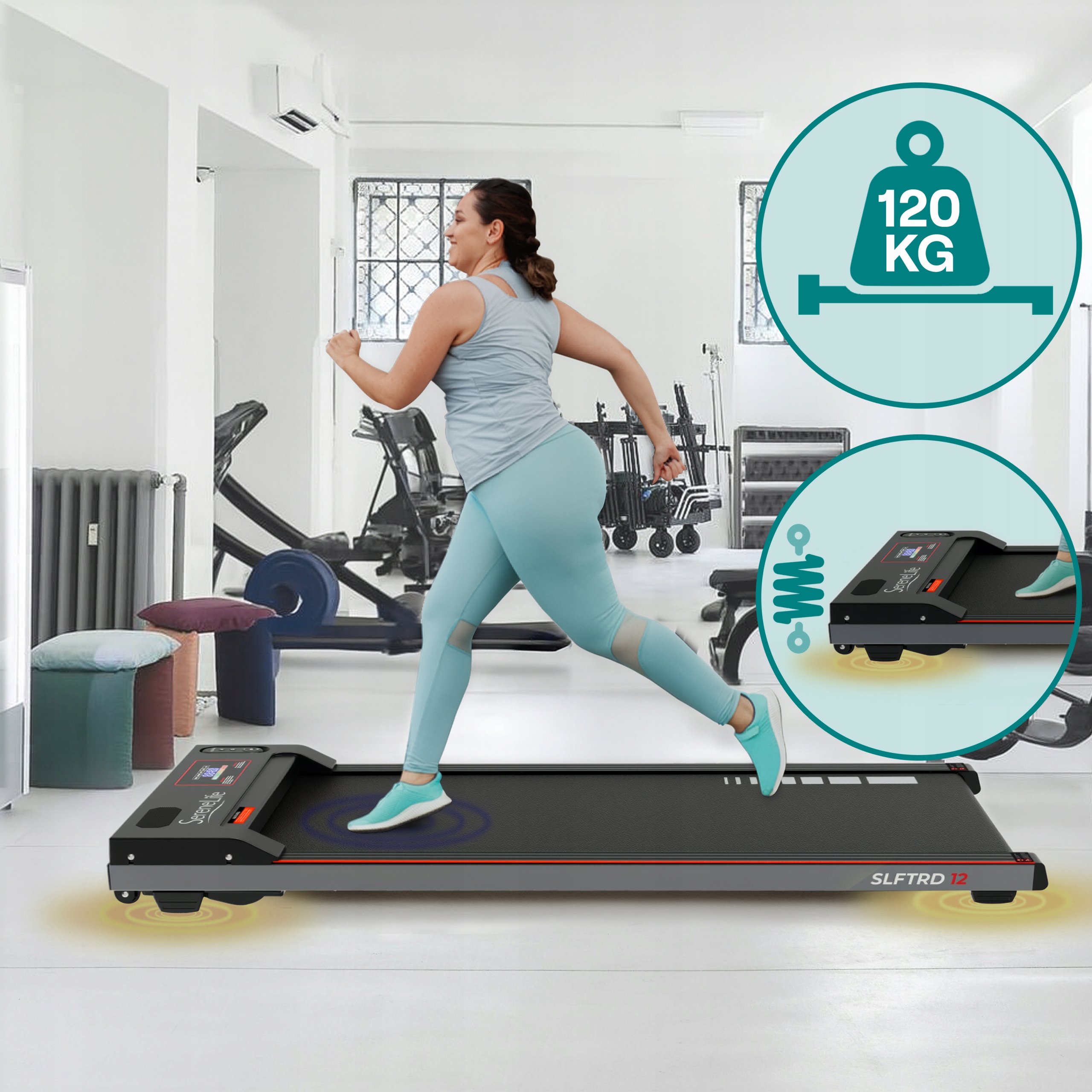 Bieżnia dostarczana jest w pełni złożona – wystarczy podłączyć i rozpocząć trening. Kompaktowa, wytrzymała konstrukcja utrzymuje do 120 kg (265 lbs). Wbudowane kółka transportowe pozwalają łatwo schować sprzęt np. pod biurko lub łóżko.
